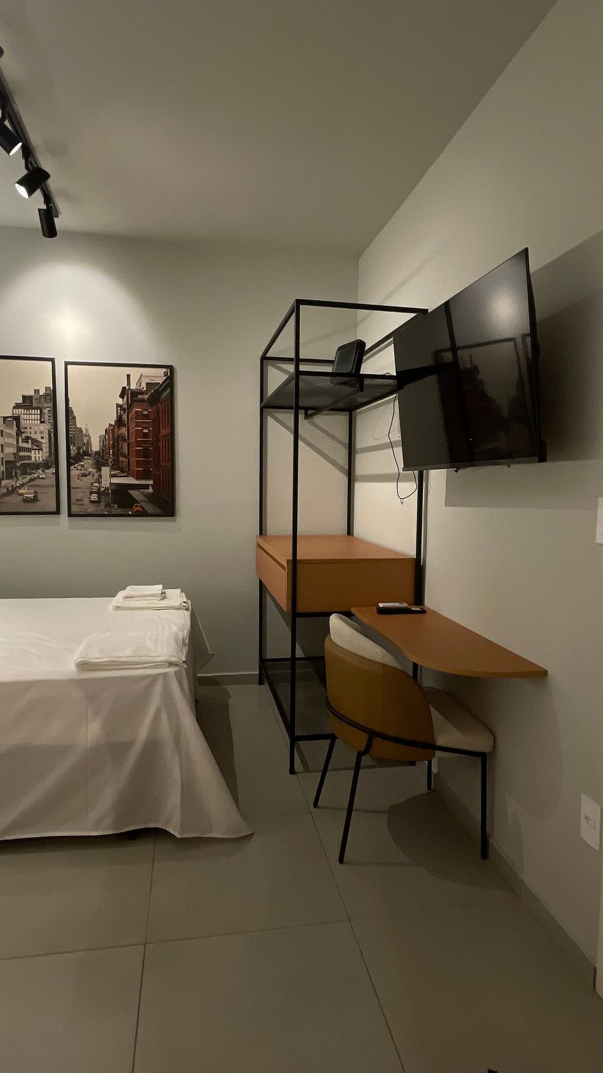 Very well decorated, equipped, clean, new studio with a great location. Close to USP, downtown and several restaurants, a quiet place to make you feel at home. Studio with a large double bed, a bathroom, closet, sofa, television, wifi, refrigerator, stove, microwave, coffee maker, among other things!