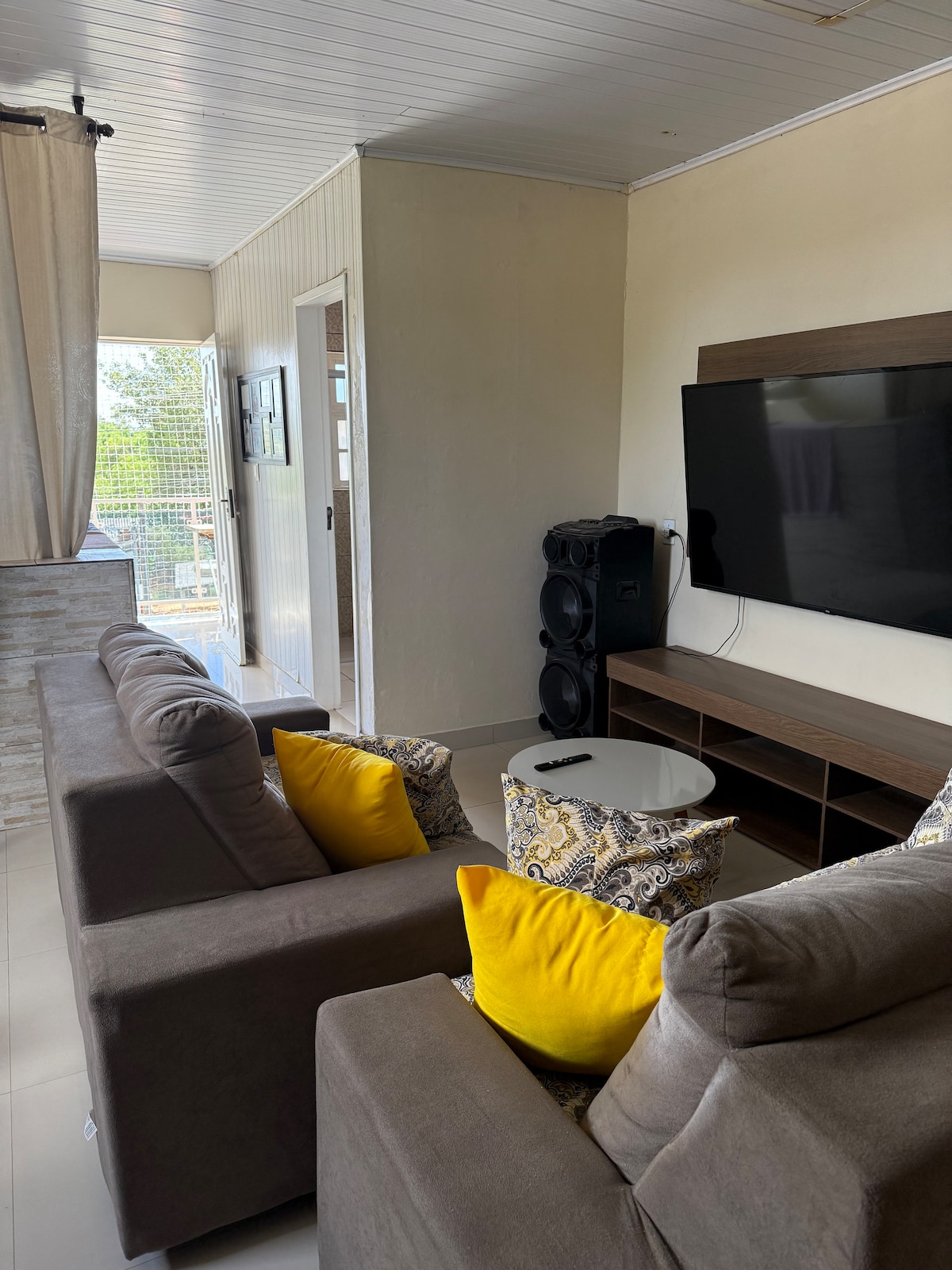 Casa de dois quartos, e sala com sofá cama. Quarto 1: duas camas de casal e uma deliche de solteiro; Quarto 2: uma cama de casal e uma beliche de solteiro. Dormitório 3: sofá cama e ventilador portátil. Sala com sofá, TV 32" e wi-fi. Ambos os quartos(1 e 2) possuem Ar Condicionado. Cozinha completa, com utensílios básicos de cozinha( pratos, talheres, panelas), mesa e cadeiras, geladeira, fogão com forno, microondas, e chaleira elétrica.