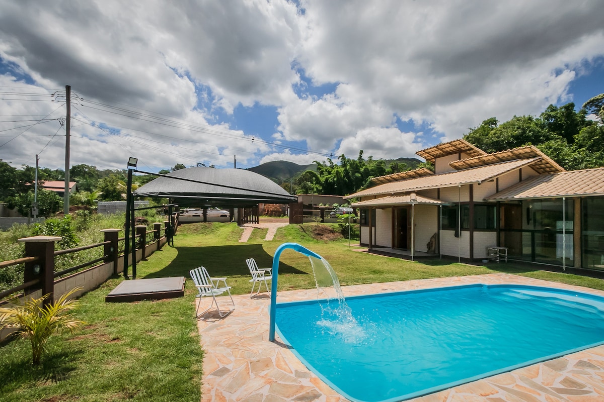 Enjoy relaxing in a gated community for up to 10 people, safe place, 24-hour concierge, a 2-bedroom house, 1 with a double bed, the other with 2 beds, the rest being mattresses, large living room, kitchen with refrigerator, gas stove, sandwich maker, blender and all necessary utensils, 2 bathrooms, gourmet area with barbecue, wood stove and oven, 3 hammocks for resting, tire swing, dollhouse, pool table, foosball, pool with waterfall and hydro. *Fiber optic internet with Wi-Fi.