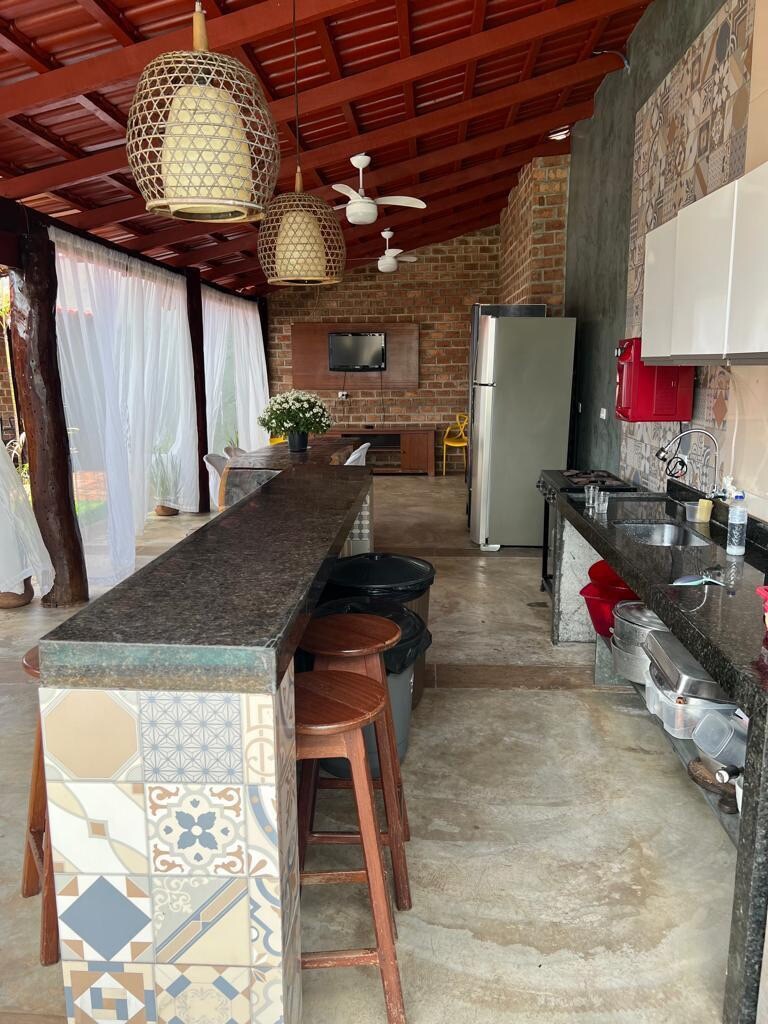 Seasonal rental house in Araguaia in the city of Luiz Alves/GO: - 6 full en-suites with cabinets with 18 Box beds and air conditioning (with room for more mattresses) - Wi-Fi - Parking - Laundry - 65” TV, sofas and table - Full kitchen with barbecue grill. - External bathroom - Swimming pool with whirlpool, children's compartment, custom waterfall, LED lighting.