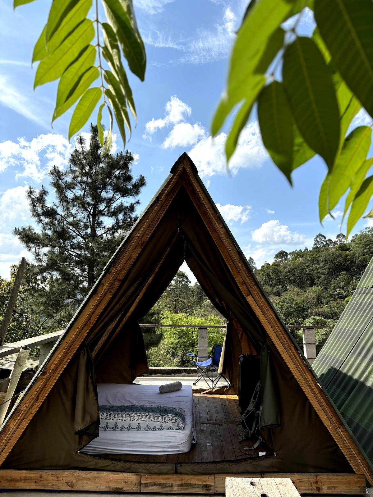 ⛺ Glamping - Eco Cottage Glamping is the fusion of the words camping and glamour, and is proposed to offer an adventure in nature without giving up comfort. The 3 units of the eco-chalets were built with our own hands, with sustainable practices and a lot of affection, and invite you to a unique experience in Serra da Cantareira with warmth and environmental responsibility. 🌿