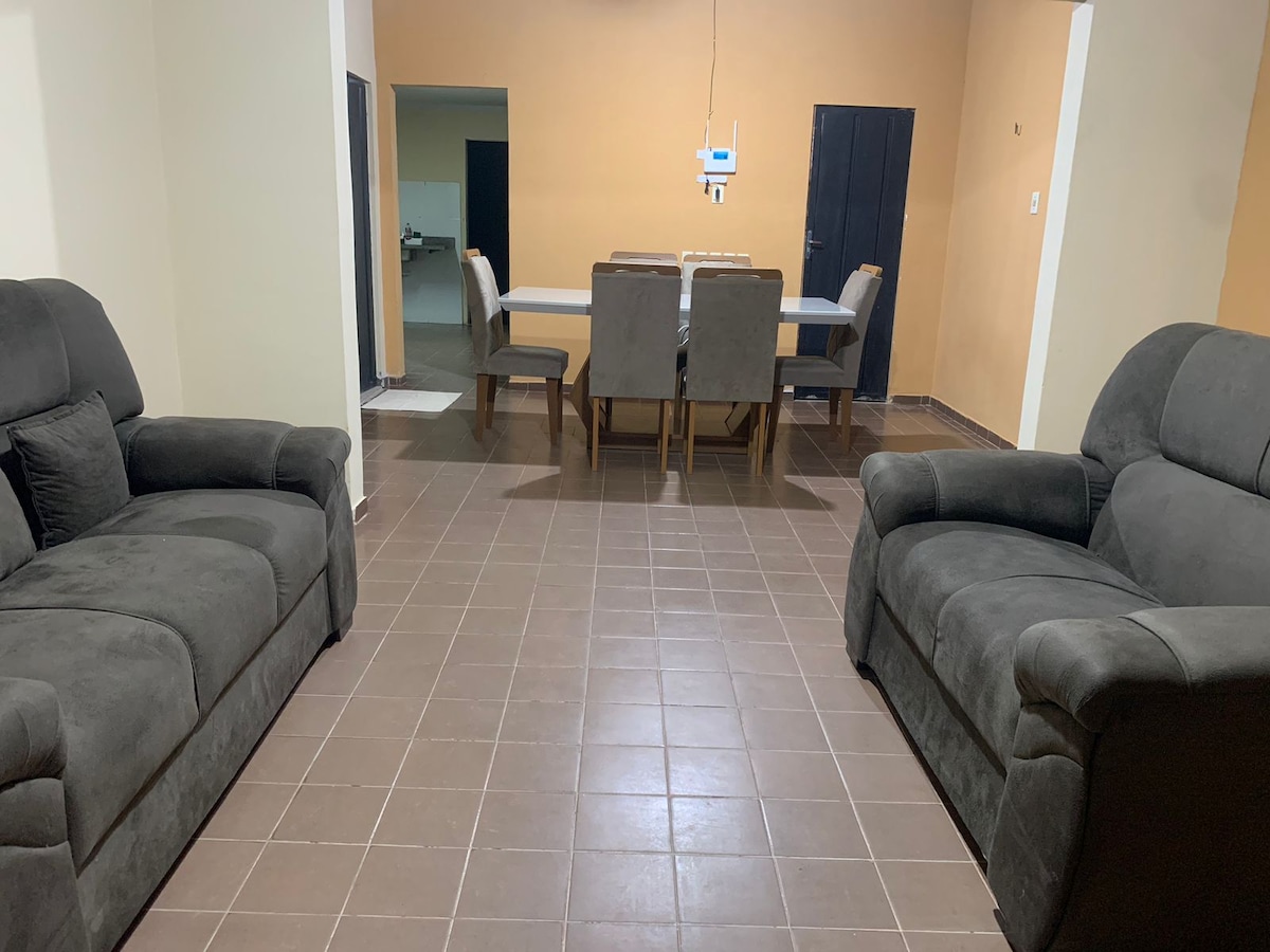 Relax with the whole family in this quiet accommodation. It has everything you will need for a wonderful stay! With 5 rooms and 2 bathrooms, stove, fridge, oven, electric iron, blender, washing machine, TV, sofa and hammock on the balcony for you to relax. It is only 5km from downtown, has a supermarket 1.5km and is next to a sports arena for those who enjoy playing Beach tennis or soccer.Best place to stay during your tour of the Serra da Capivara National Park.