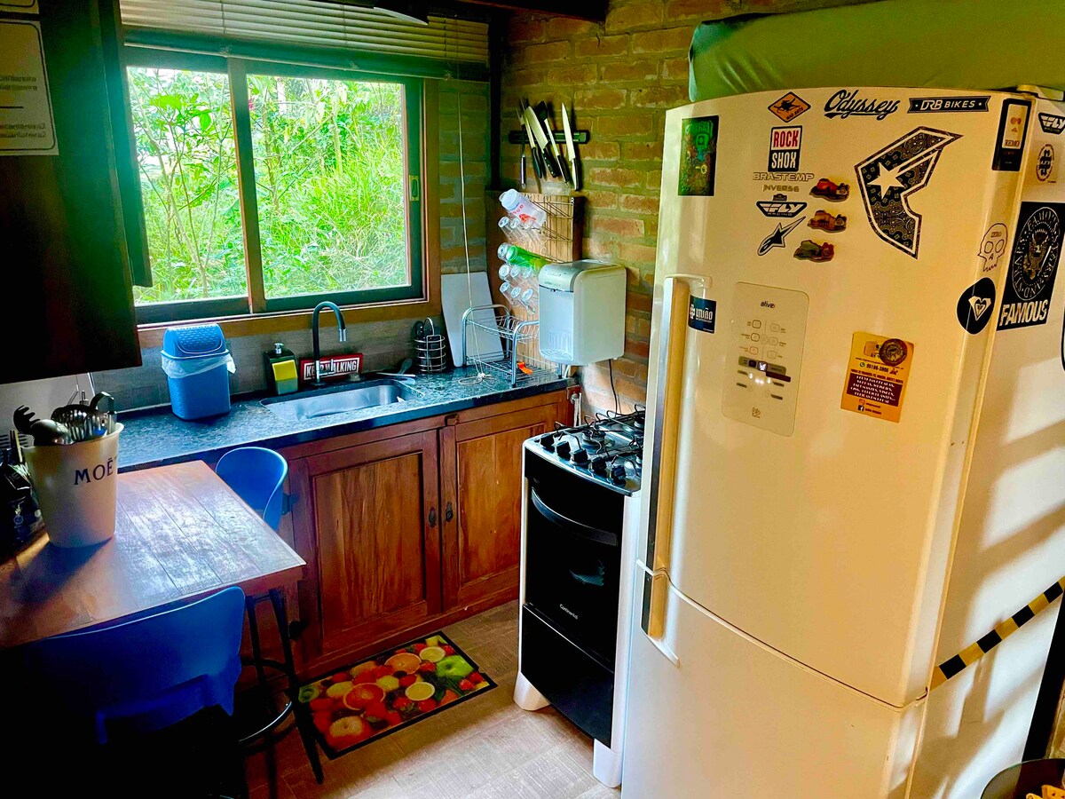 Inside Sítio Kaa Puã, surrounded by nature, the chalet offers a wonderful view of the mountains and the sunset. Here you can enjoy a variety of outdoor options, such as our hammock area and the orchard of fruits and medicinal plants. The chalet is simple, cozy and well cared for, offering all the comfort you need for a relaxing stay. On the balcony, you will find a portable barbecue grill, perfect for enjoying a delicious outdoor barbecue.