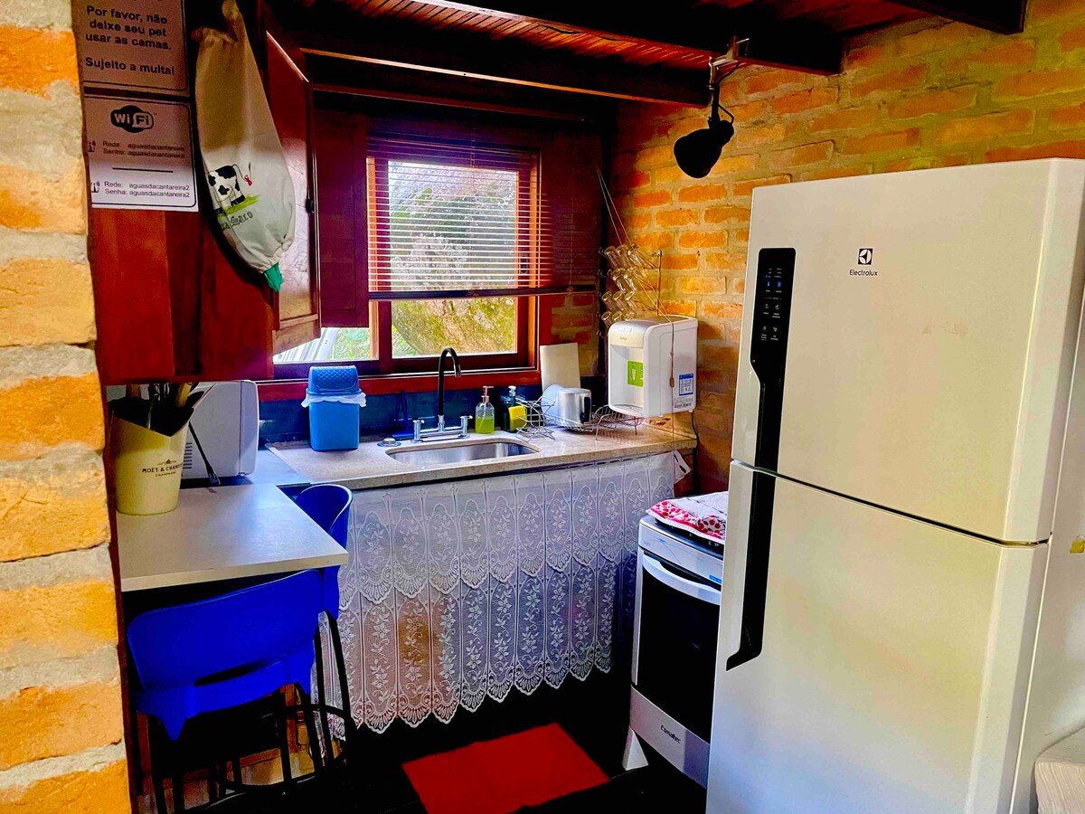 Welcome to Netinhos Sítio! 🌿✨ Here, you’ll find private and fenced chalets 🏡, perfect for relaxing in total tranquility. 🌳 Enjoy a cozy queen-size bed 🛏️, a compact kitchen 🍳, a living room with a sofa bed 🛋️, an eco-friendly fireplace 🔥, and a TV with streaming services 📺. Relax in the indoor hot tub 🛁, the outdoor ofuro 🌌, and the wood-fired barbecue 🍖🔥. An exclusive retreat to disconnect and connect with nature! 🌟🍃