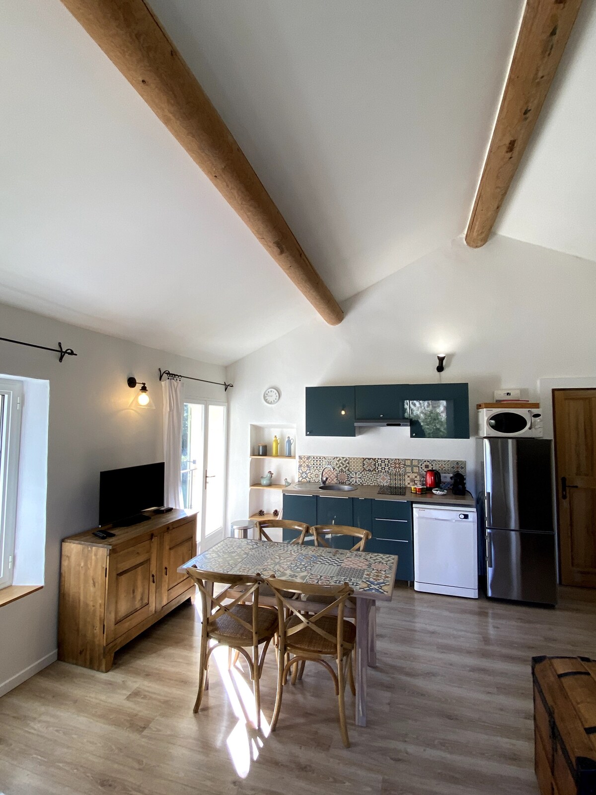 Bright apartment composed of a large bedroom with double bed (new mattress dating from February 2024) separated from a large living room with a large Moroccan sofa (see photo, large enough for 3) which can be used as a bed for 2 people thanks to its very comfortable mattress topper (February 2024), a smart TV, a coffee machine and a dishwasher. Large dining table for 8 people. Located just across from an in-ground pool, with synthetic grass and shaded deckchairs