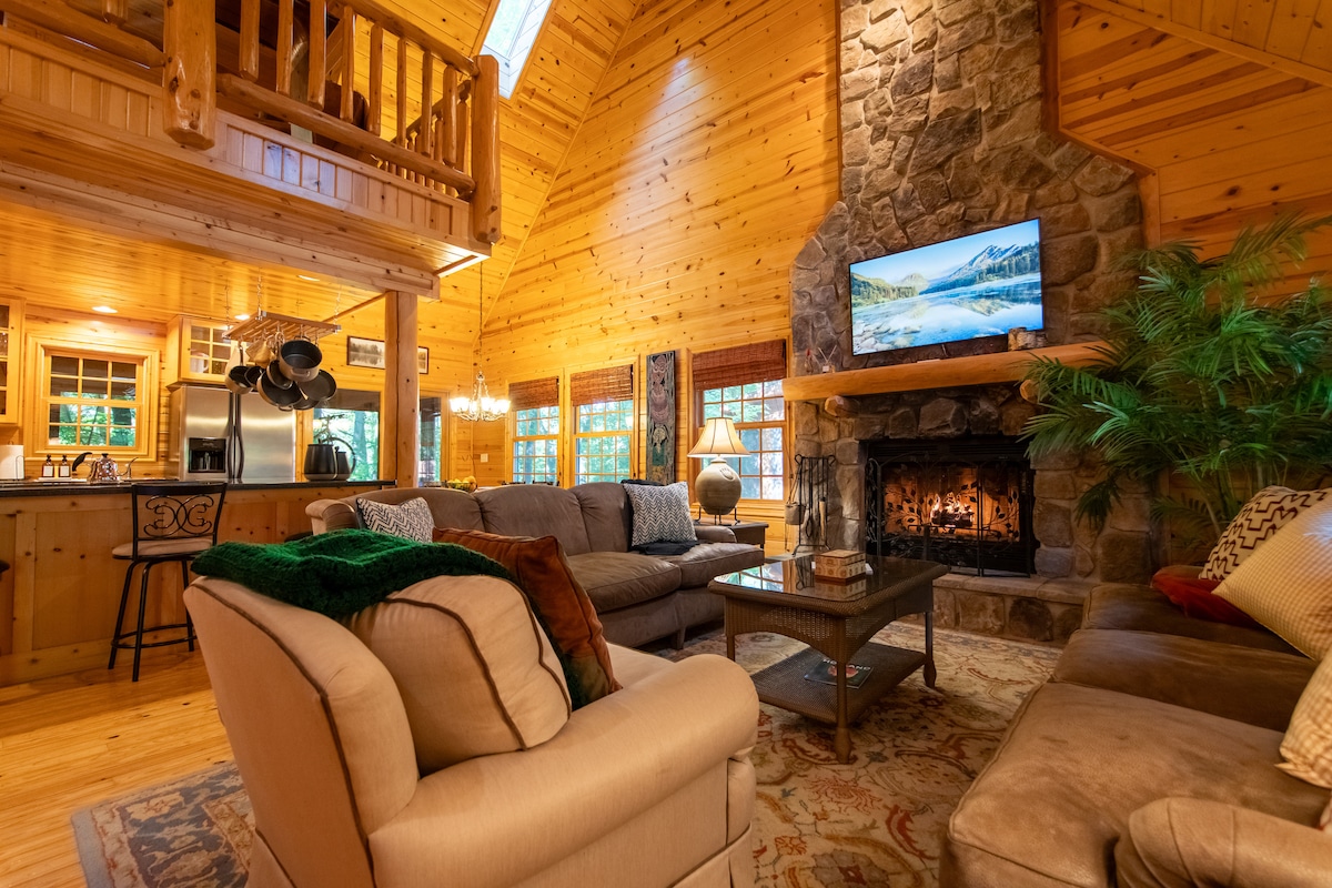 Our cozy 3 bedroom, 2.5 bath luxury rustic cabin features all the comforts of home and more. Fully furnished for your comfort with towels, linens and other necessities. This cabin sleeps 8 comfortably. A heated pool and lake access are available from Memorial Day to mid September. Full-size washer & dryer in the cabin for your convenience. For larger groups, ask about availability to also rent one of our affiliated cabins nearby.