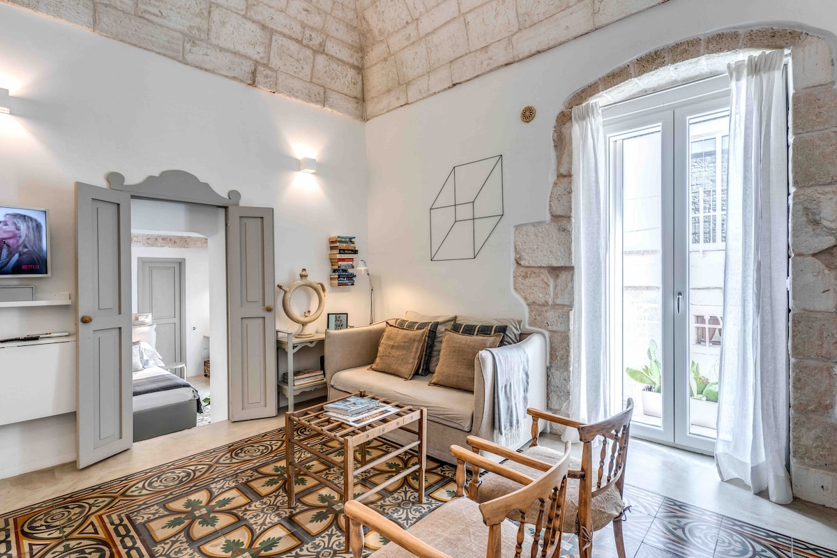CIS: BR07401291000000188 CIN: IT074012B400033730 Vivi la magica sensazione di trovarti tra passato e presente: è una dimora storica! I pavimenti d'epoca e le pareti in pietra fanno da sfondo a un ambiente arredato con oggetti di design, vecchie ceramiche e mobili locali. L'ampio terrazzo privato, con solarium e doccia calda, saprà entusiasmarti: potrai rilassarti con un bicchiere di vino al tramonto, godere del sole su comodi lettini o preparare una cena in una magica atmosfera pugliese.