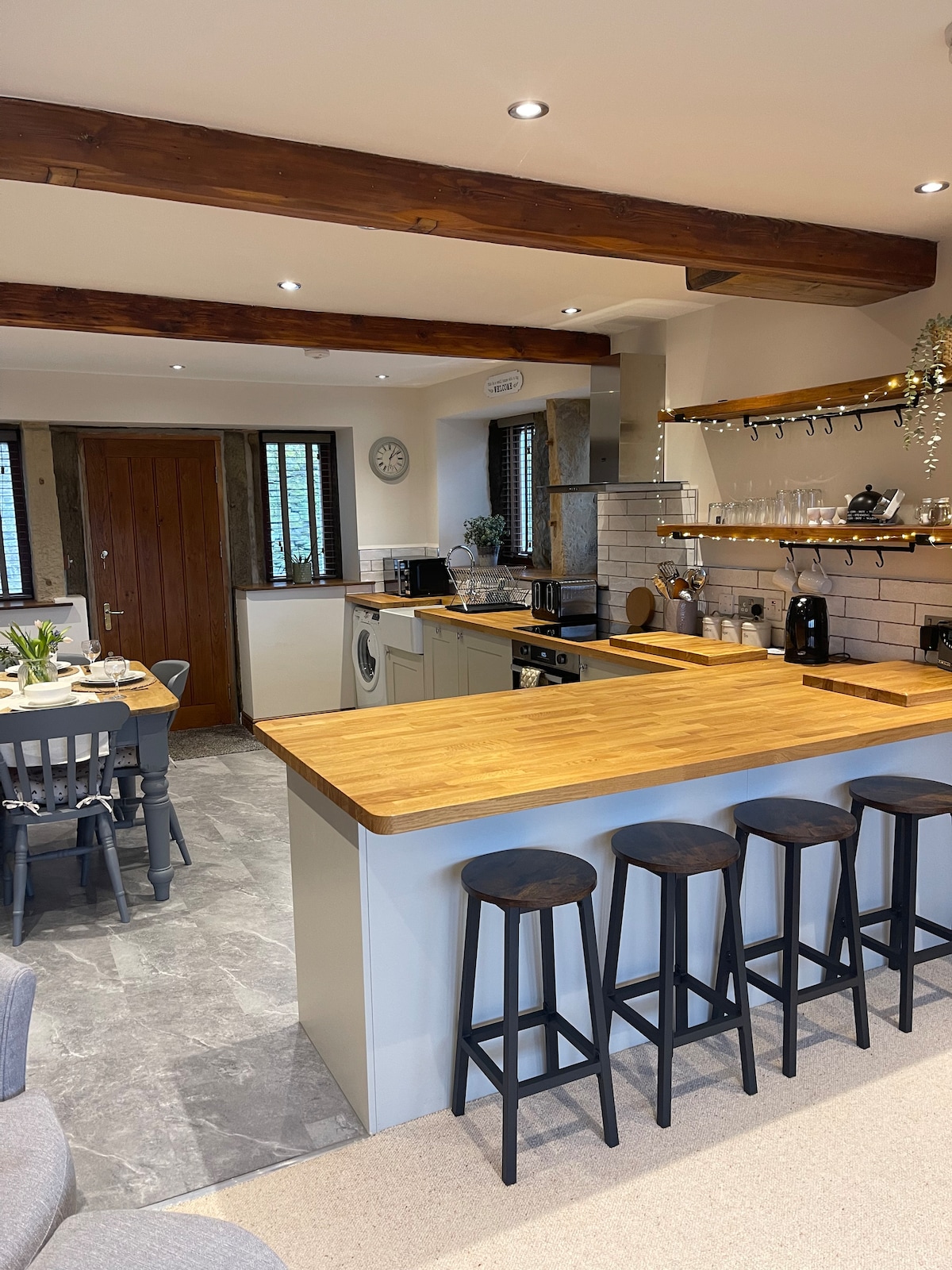 A beautifully converted space - ideal to relax and connect. You will enjoy a generous open-plan living area, a cosy log burner, and two luxurious en-suite bedrooms. Perfect for two couples or a family - with one bedroom offering flexible bed arrangement. As well as board games, books, toys and Netflix there's also a games room with table tennis. A well equipped kitchen allows you to spend time together over meals. The Victorian barn is set in peaceful countryside with stunning open views.