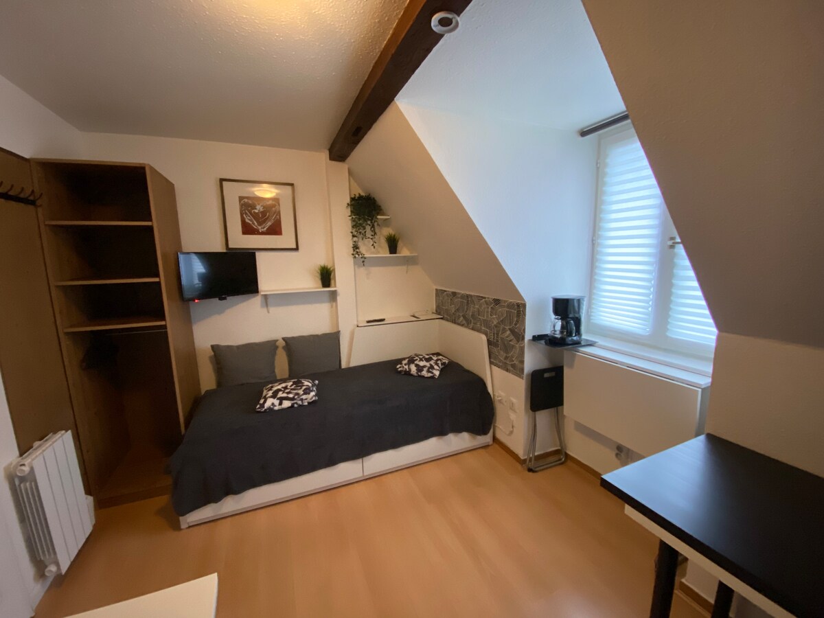 Charming attic studio, refurbished in 2022; 3-minute walk from the tram leading in 5 minutes to the train station and in 10 minutes to the city center. On the 3rd floor of a typical 1930s building, the studio includes a fully equipped kitchen area (stovetop, microwave with oven function, fridge, coffee maker), a sleeping area with a double bed, a TV and storage; a bathroom with shower, toilet, sink and washing machine.