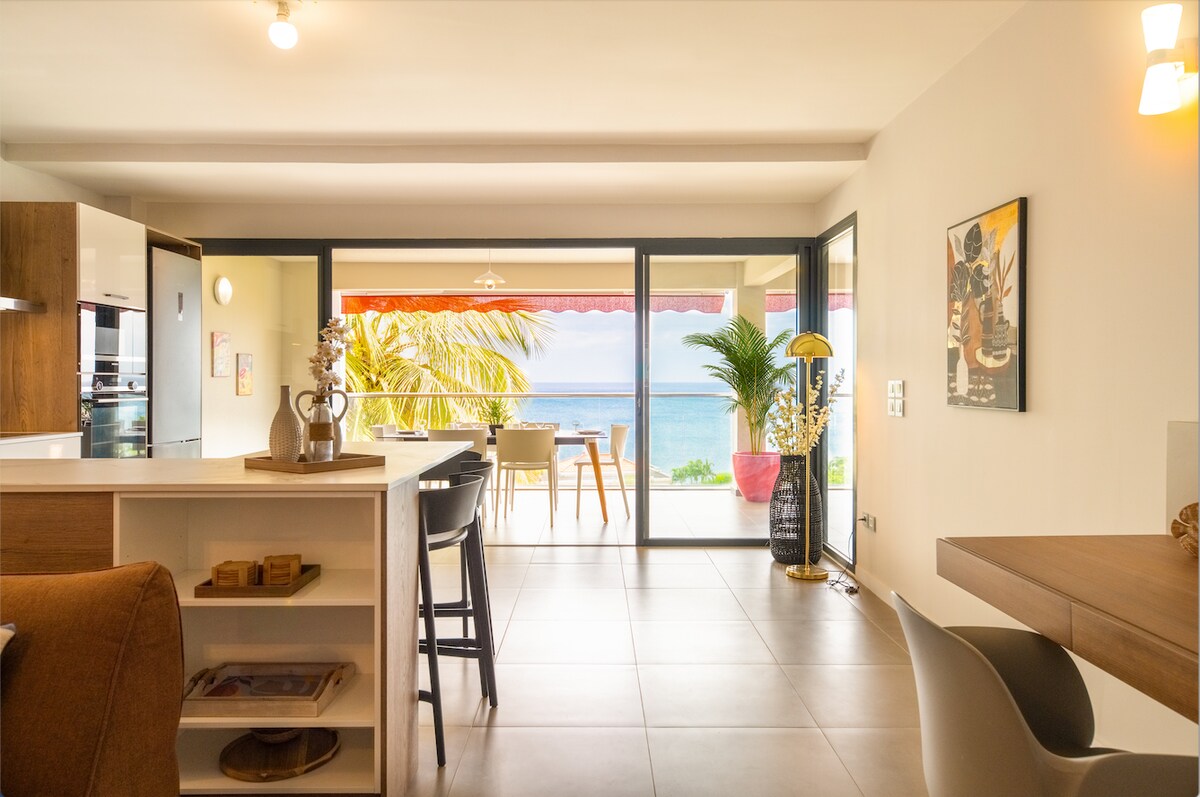 Beautiful apartment with direct access to the beach. Living room with open kitchen leading onto a large terrace with dining table for 6 people, lounge chairs and a seating area. Bedroom with Kingsize Bed with view, bathroom with walk-in-shower and separate toilet. This appartement is accessible to persons with reduced mobility. Located in Schoelcher, close to restaurants, stores and the cinema, you can easily explore the whole island, swim with turtles or simply admire the sunsets.
