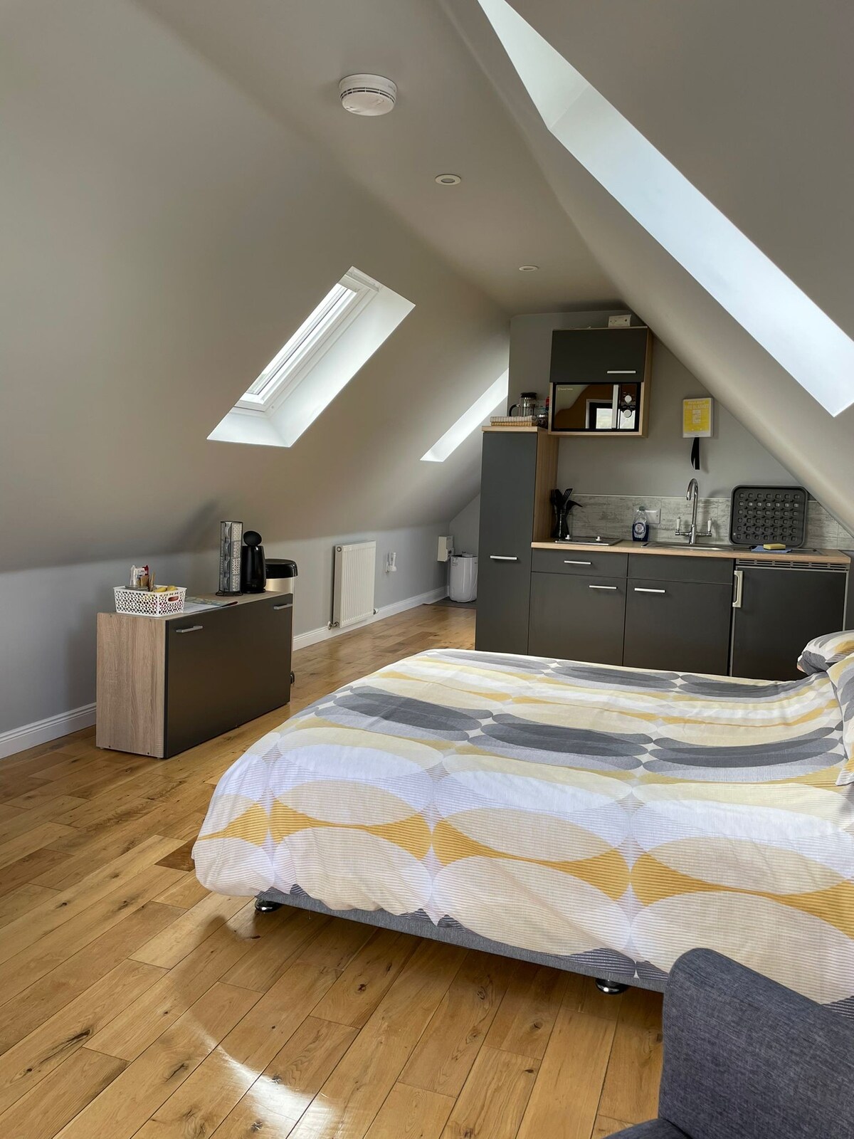 Burnside Flat is a new loft conversion furnished to a very high standard in the township of Edinbane near Portree. The flat also has the benefit of super fast wifi . Its made up of a cosy bedroom with shower room and small kitchen plus with a beautiful patio that overlooks the Loch Greshornish with some amazing food served at Edinbane Inn.