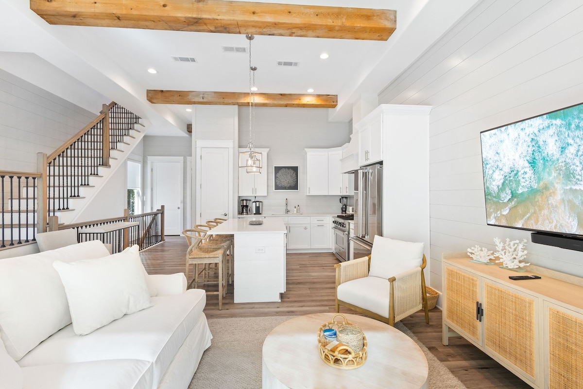 ***The private deeded beach access is a one minute walk from the front door.** Welcome to Between the Blues, an elevated coastal retreat tucked inside the sought after Summer’s Edge community along 30A. Designed for comfort, privacy, and effortless beach access, this home delivers the layout and location of dreams. Four true king suites (upstairs king suite has bonus mini fridge, coffee maker, and private patio) Dedicated bunk room with four twin beds Four and a half baths Sleeps 12