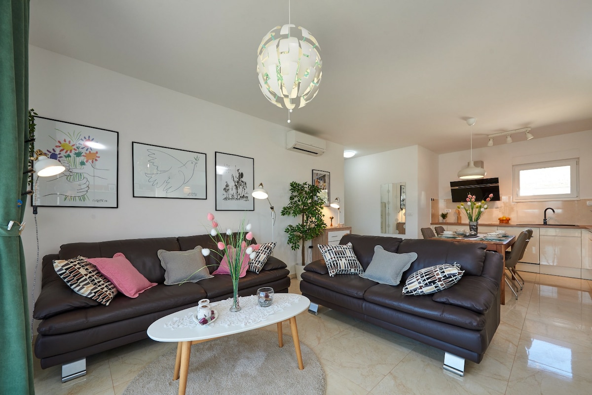 Provedite svoje praznike u mirnoj oazi s jedinstvenim pogledom na more i otoke. Apartman se sastoji od dvije spavaće, idealan za četvero osoba. Dizajnerski uređen apartman sa kvalitenim namještajem i kućanskim aparatima. Dostupan je i vinski hladnjak u kojem se nalazi vrhunsko hrvatsko vino. U hladnjaku će vas uvijek dočekati pivo,coca cola,voda,mlijeko, grickalice,sir,kruh i ostalo. Apartman je smješten 3 km od grada Trogira.