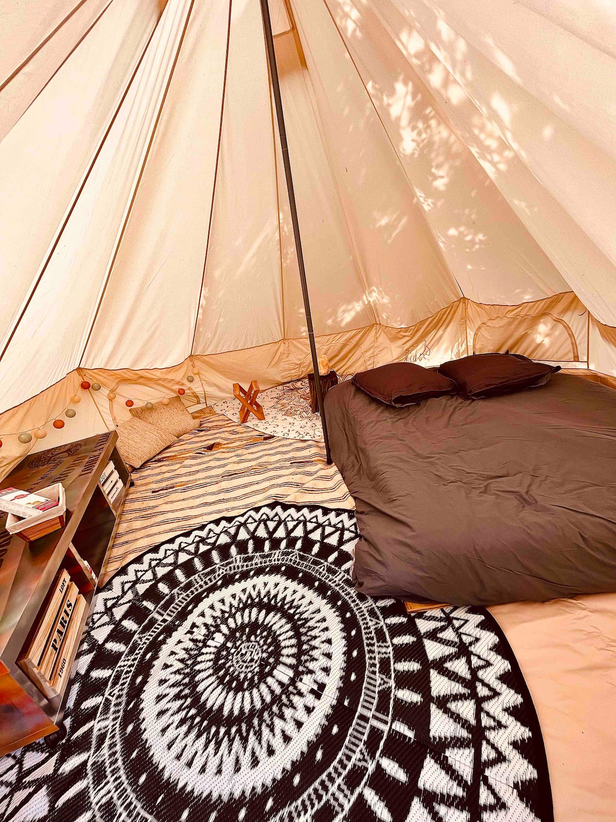 The Owl Lodge: the comfortable alternative to camping! Comfortable and spacious, the Lodge tent is just as suitable for romantic stays as for families of up to 4 people. Designed and built to allow you to live indoors and outdoors with complete peace of mind, it is equipped with good cozy beds to spend a good night, and a terrace to have your meals and bask in the sun.