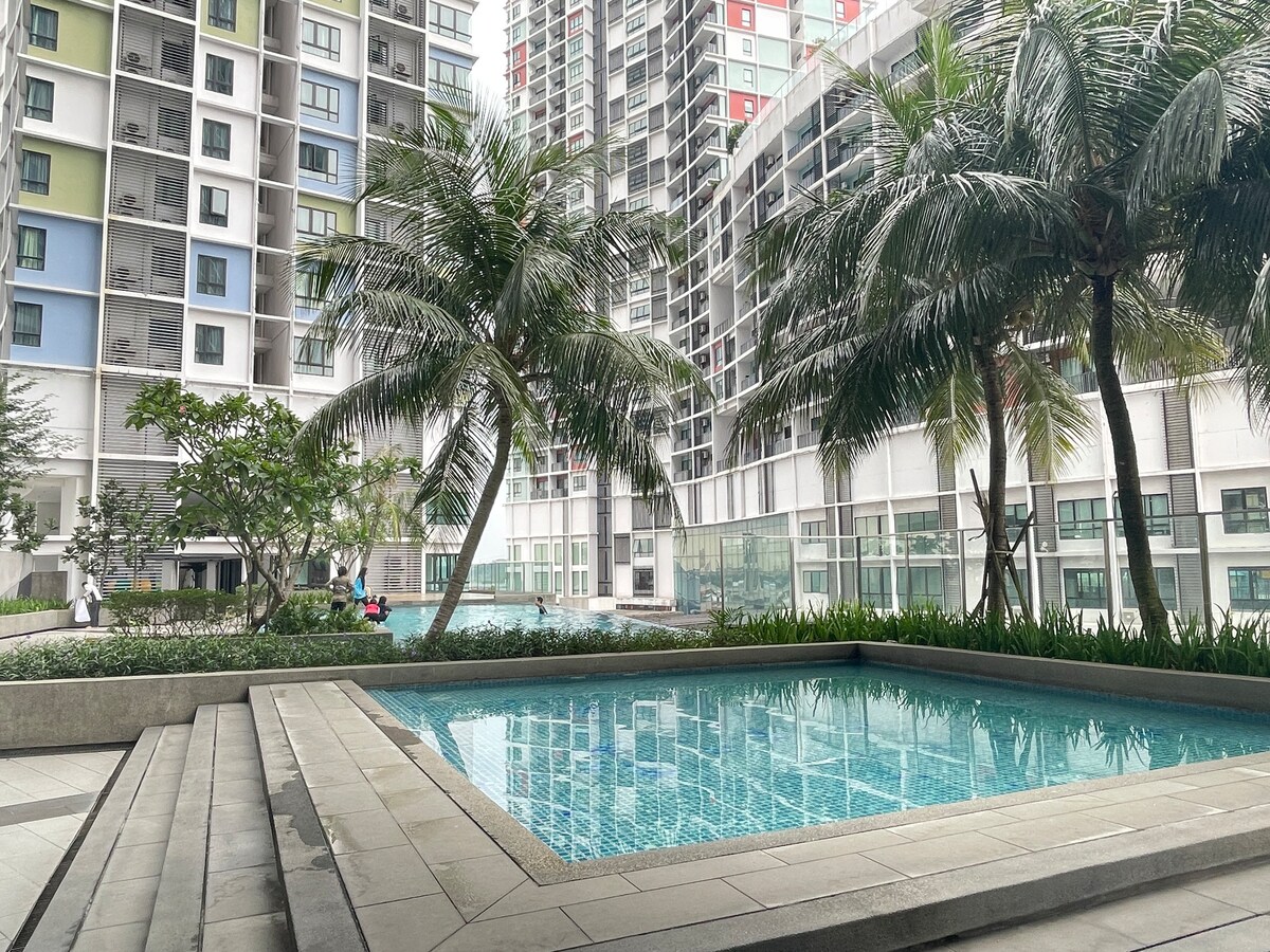 This spacious apartment is perfect for a big family vacation. It can cater up to 8 persons, with a free parking pass, wifi and Netflix ready smart TVs to enjoy. Facilities include big swimming pool, complete with sauna and gym facilities. Very strategic place, located next to the i-City Theme Park and connected via skybridge to the Central i-City Mall, the biggest mall in Shah Alam featuring global brands, supermarkets, cinema, restaurants and cafes that bring exciting shopping experience.