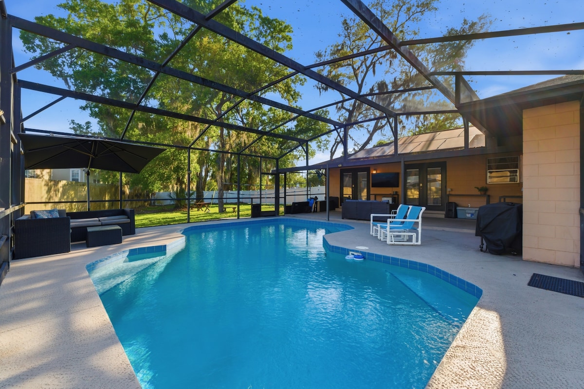 Perfect for families & groups â The Blue Villa! Sleeps 8: King, Queen, Twin, Trundle + Folding bed Heated private pool 24 hrs + BBQ Fully equipped kitchen Wi-Fi 1Gbs - 3 Smart TVs Free parking 4 cars + EV Charger L2 Home gym: elliptical & stationary bike Game room: ping pong, billar, darts, etc Private patio - quiet & safe area Workstation - in-unit laundry 24/7 Superhost support 30 min to Disney, Epic Universe & MCO Airport Self check-in via keypad. Make yourself at home!