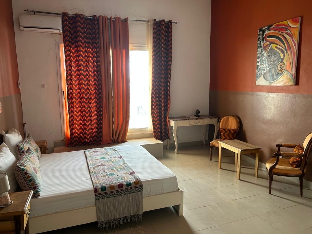 Experience Dakar in our seafront property. It is spacious and it offers free daily cleaning, AC in every room, and a 24/7 concierge for a seamless stay. This room is connected to a spacious private living room. Breakfast is available on demand Enjoy added convenience with optional services like tourist guides, and airport shuttles tailored to your needs.