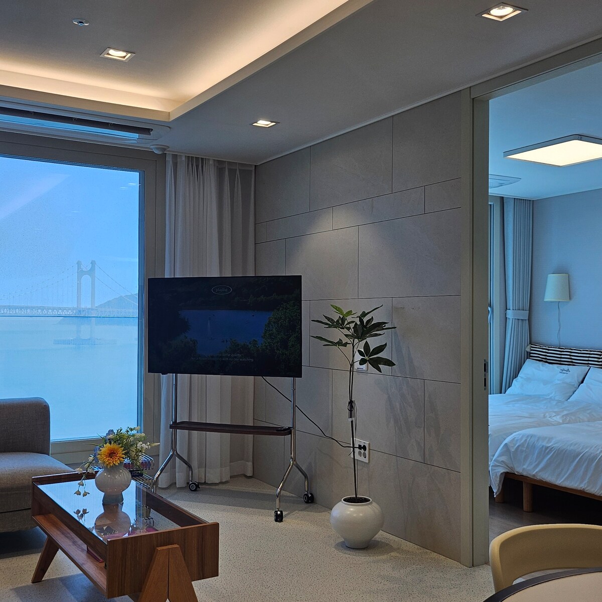 @stay8usanhang is a space overlooking Busan Port, thoughtfully designed to offer comfort and inspiration. Every detail, from music and fragrance to ambiance, interior, and bedding, has been carefully curated to enhance your stay. -Sky bridge connected to Busan Station (5-minute walk) -1 Super King bed, 3 Super Single beds Ocean-view bathtub (spa-ready) - Fully equipped / ideal for family travelers 50-inch large TV with Netflix, YouTube, OTT, and broadcast channels Bang & Olufsen speakers