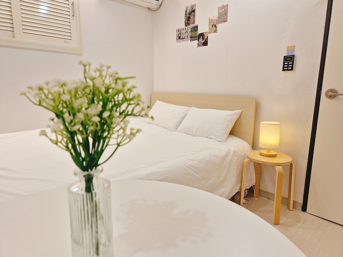 [new open] โ Stay Sai [1 Room] -. Maximum number of people: 1 -. It's a neat and cozy space to stay alone. (There is a separate bathroom) -. There is no elevator and a single room is randomly assigned to the 1st and 2nd floors:) -. It is located right in front of the hot Gwangjang Market and a 3-minute walk from Jongno 5-ga Subway Station. -. You can pack delicious food at Gwangjang Market and eat it in a pretty common area. -. We provide 6 types of Korean ramen for free for guests:) -. There is a pretty common kitchen where simple cooking is possible:) -. Equipped appliances: washer/dryer/refrigerator/microwave/toaster/cooking utensils/kitchen utensils/air conditioner and heating in each room We use โ hotel bedding and provide clean bedding that has been sterilized and washed every time. It is a safe accommodation with regular quarantine through a professional company โ every month:) It's a clean space where the โ host manages the cleaning themselves.