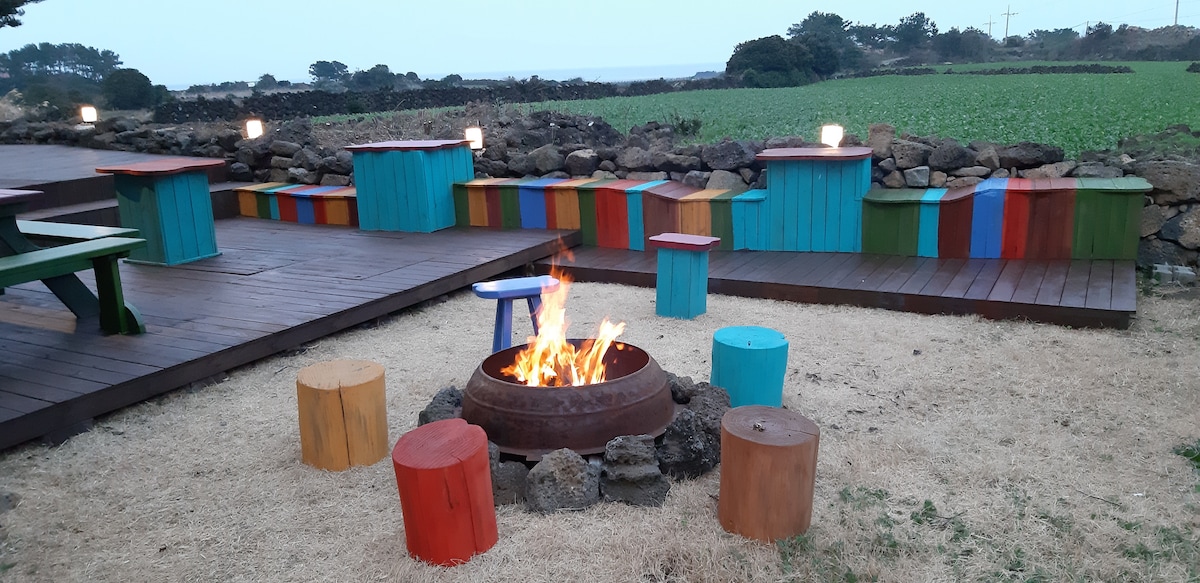 Located in Pyeongdae-ri, Gujwa-eup, Jeju-si, [Pyeongdae-ri] is a private rental house. We only offer a "whole house" service to "one team" per day. It is located 5 minutes to Bijarim, 5 minutes to Woljeong-ri Beach, and 5 minutes to Sehwa-ri Beach. You can enjoy a wonderful view of Jeju's stone wall and the sea from the living room. A beam projector and soundbar are installed, so you can watch a movie if you bring it on a USB. There is a fire pit for barbecue in the yard. We'll light the fire at the time you want, so you can start barbecuing right away. The cost is 30,000 KRW. A fire pit set is available for you to sit in the yard and spend time. We prepare firewood for 2 hours and the cost is 20,000 won. We'll light it up at the time you want.