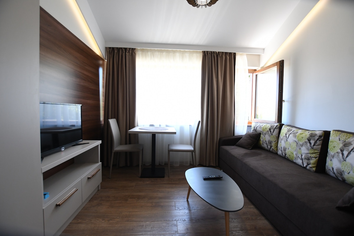 Jednosobni apartman sa moderno opremljenom dnevnom i spavacom sobom, kuhinjom, trpezarijom i kupatilom. Apartman sadrzi klima uredjaj, flat-screen TV, besplatan Wi-Fi, posteljinu i peskire...