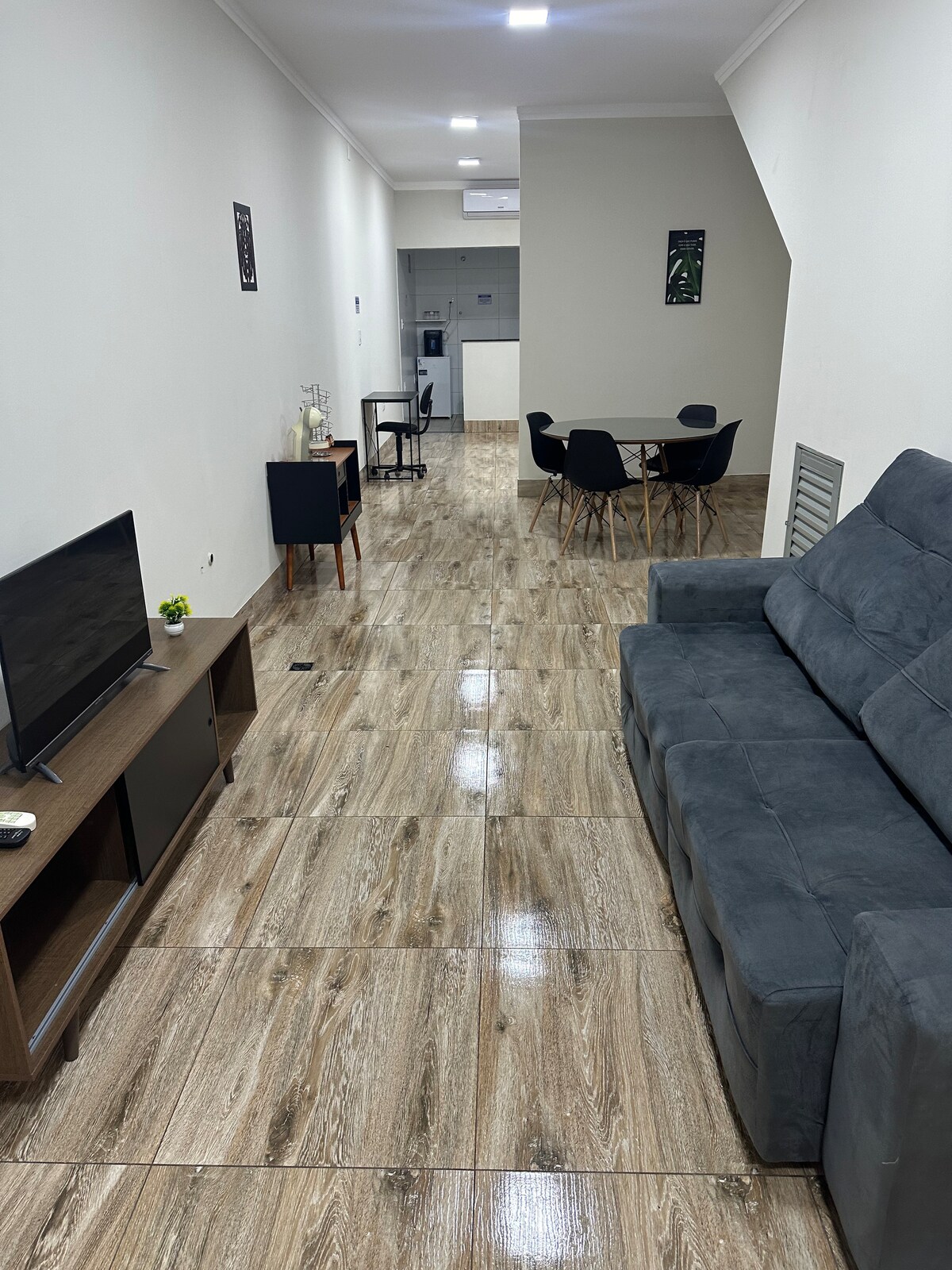 Newly built apartment in the center of Sertãozinho. Space for up to 3 people. Strategic location near pharmacy, bank branches, supermarket and gas station. Bakery located on the corner of the apartment. Included are air-conditioning, ceiling fan, double bed, retractable sofa, microwave, table, stove and TV. Bed linen, bath linen, pillows, blanket and kitchen utensils are available for use. Parking space in a store parking lot on the next street.