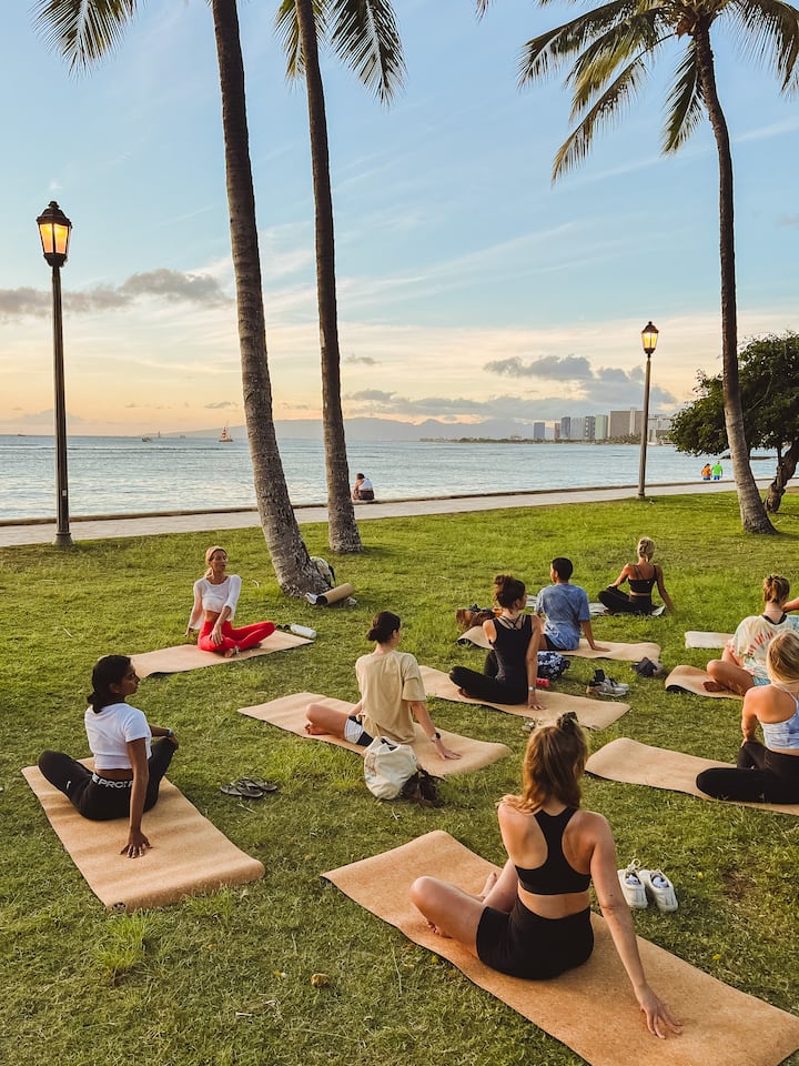 Enjoy outdoor yoga on Waikiki’s ocean-side lawn with gorgeous views.