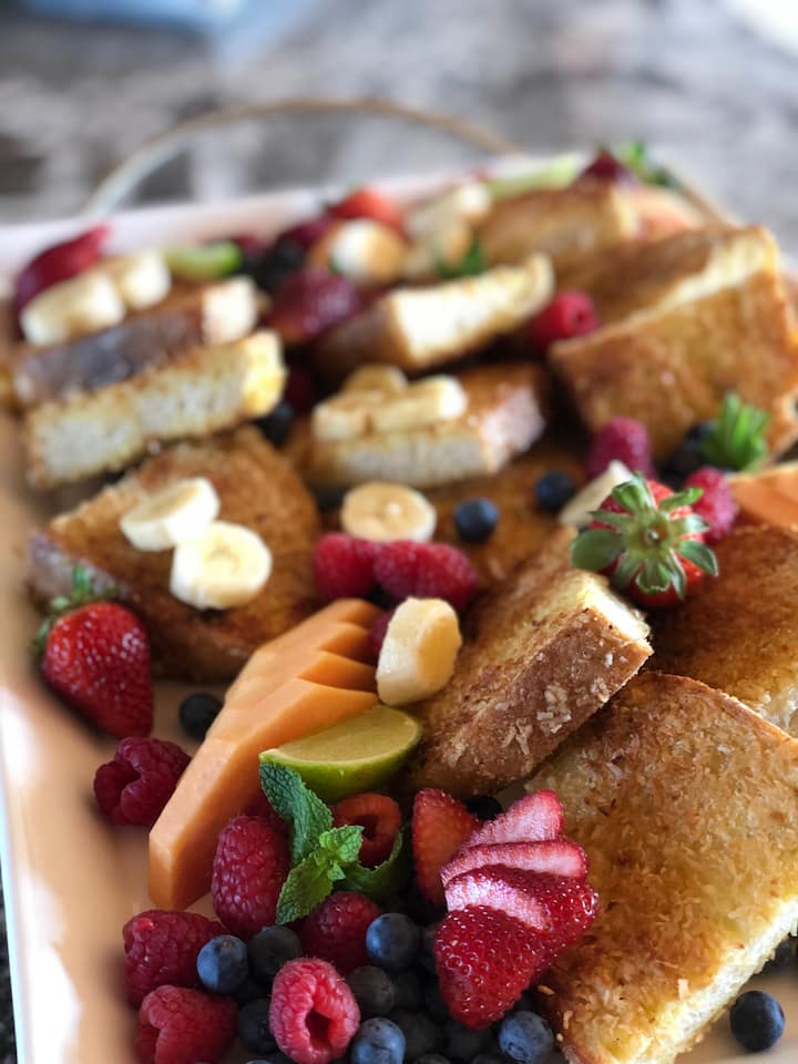 This relaxed brunch can include: fresh pastries or warm banana bread, seasonal fruit with honey and yoghurt, soft-scrambled eggs with herbs, smoked salmon with lemon and dill, avocado with herbs and toasted seeds, local grilled sausage, and fresh coffee and tea service.