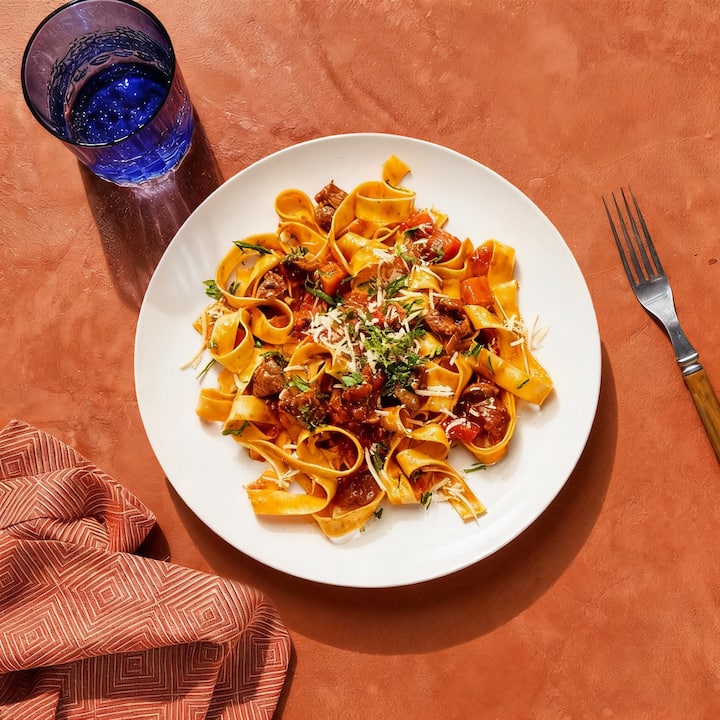 Delivered fresh to your door between 10AM - 8PM. Rich pork shoulder, slow-cooked until falling apart-tender with tomatoes, carrots, onions, and celery, creating a rich and robust sauce. Served over wide and silky pappardelle noodles.