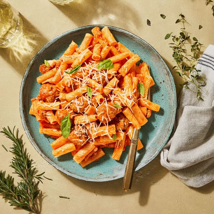Delivered fresh to your door between 10AM - 8PM. 4 Meals + 2 Sides + 2 Desserts. Shareable staples you'll want seconds of— Penne a la Vodka (stunningly simple creamy sauce with basil and Grana Padano), Mom's Meatballs (house-made marinara, infused with a kick of spicy sausage) The Greek Side Salad (fresh veggies, green olives, and crumbled feta cheese), Creamy Kahlua Tiramisu (soft, spongy ladyfingers, velvety mascarpone, and a dash of cacao powder). Includes 2 of each item.