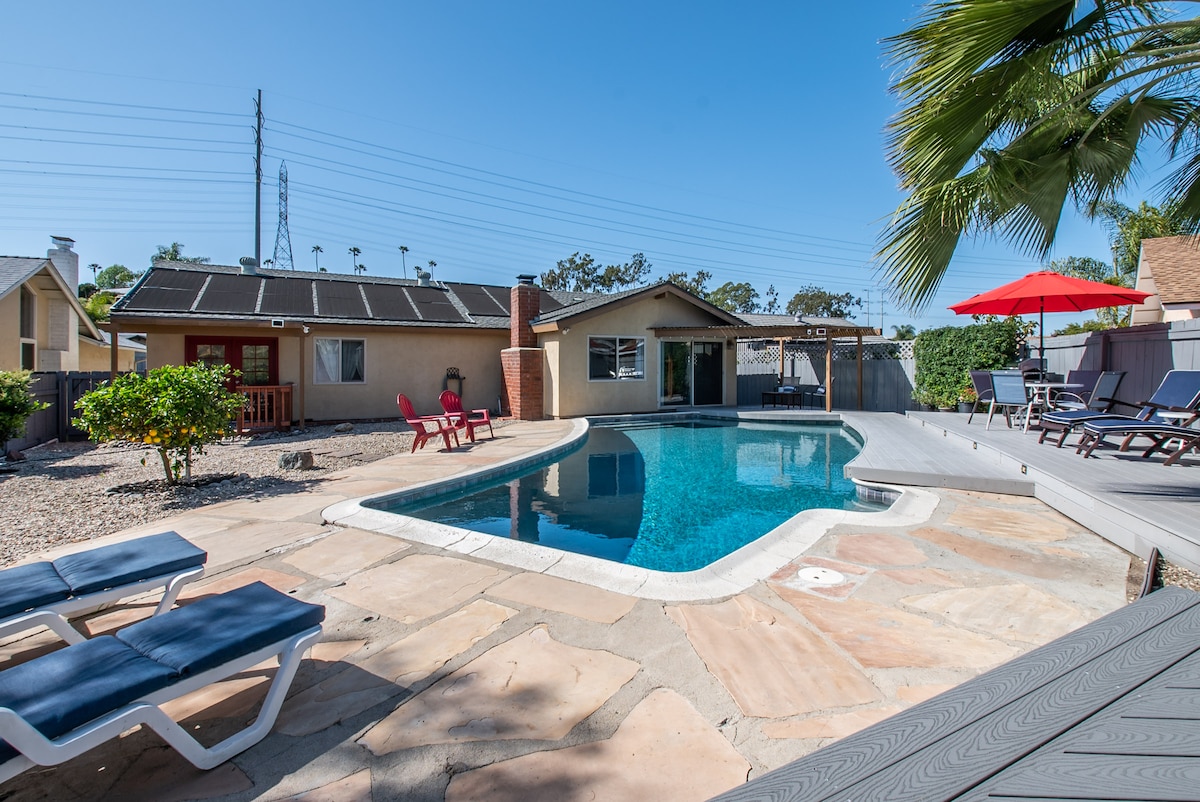 Beautiful family vacation retreat! Amazing backyard includes your own private heated pool, a spacious deck for relaxing with lounge chairs, dining spaces, and fire table. Fenced for privacy. Inside enjoy the game room and arcade, smart TVs located throughout the house, and air conditioning. Strong Wi-Fi signal, including the outdoor deck area. Amazing location close to all SD has to offer: within 20 minutes of the zoo, beaches, Sea World, downtown, and the airport! Private parking.