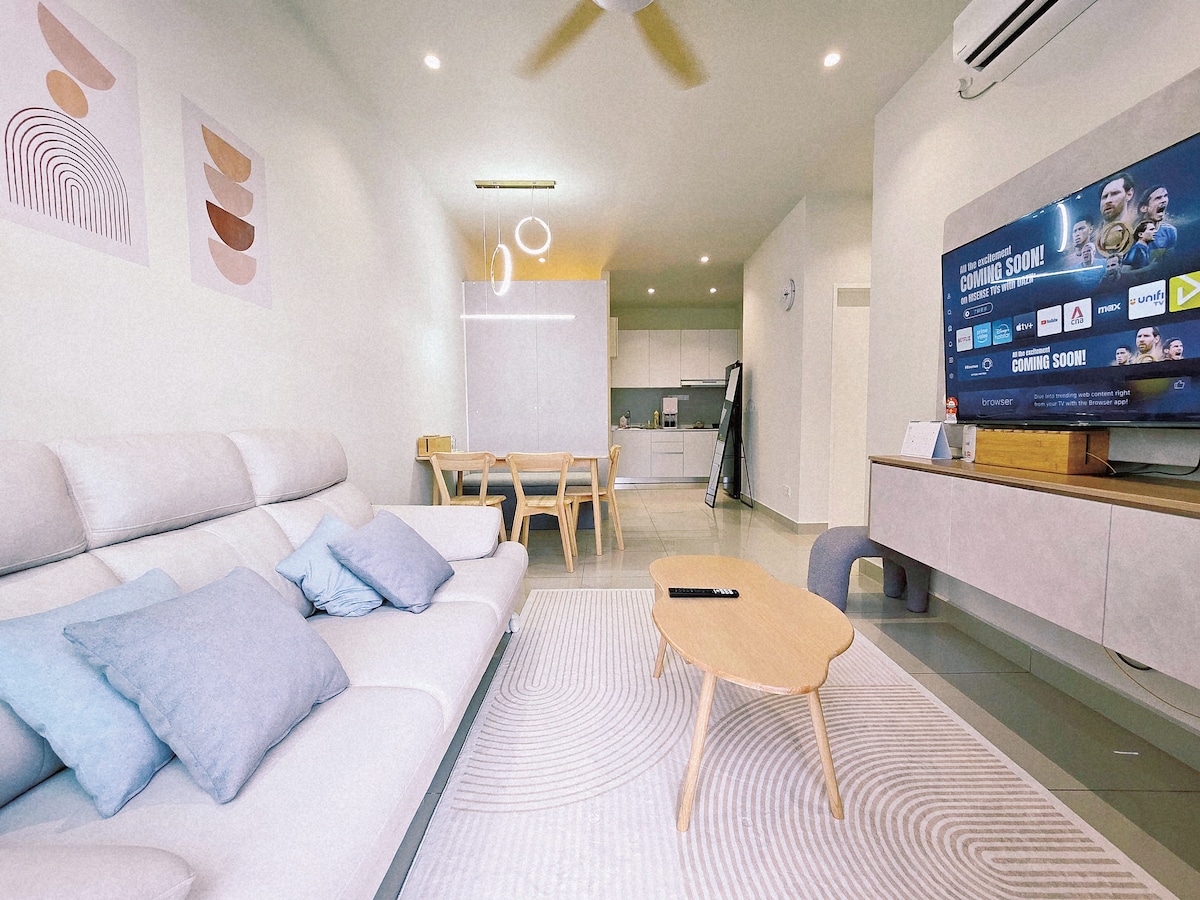 *NEW* DM me the word "New package" to enjoy 8% cashback. Escape to our stylish 2BR condo on the 33rd floor in Johor Bahru. This modern minimalist retreat offers stunning city skyline views and comfortably sleeps 6-7. Perfect for families or business travelers, it features an HD projector with Netflix, high-speed 5G Wi-Fi, and a well-equipped kitchen. Enjoy a unique urban getaway with resort-style amenities.