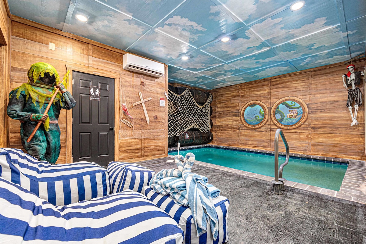 Welcome to SwimTastic, your brand-new luxury cabin in Wears Valley! This private retreat features its own indoor pool, a spacious flat play area, a theater room, an arcade room, a relaxing hot tub, and an outdoor fireplace with cozy seating and a TV. Surrounded by serene mountain beauty, SwimTastic offers the perfect combination of fun and tranquility. Whether relaxing by the fire or enjoying endless entertainment indoors, this cabin is perfect for families or groups. Book your escape today!