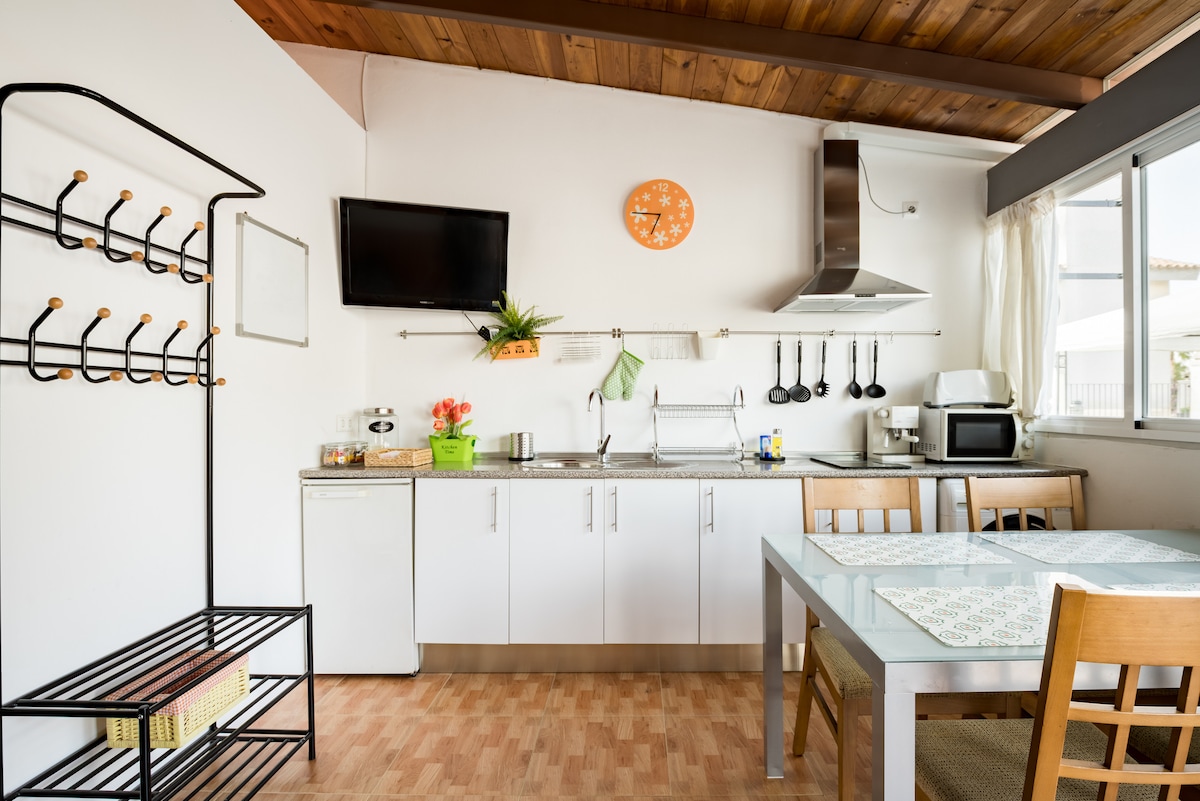 Nuevo apartamento en planta baja de mi casa, con puerta independiente. dormitorio con cama doble, salon amplio con sofa cama doble, y sofa cama 120, baño completo, zona de offi para comidas rápidas y desayunos, placa induccion, microondas, tv. Club social con piscina y bar, desde finales de mayo hasta septiembre. A 6 mnts del centro de sevilla en auto, con buena comunicación de bus y metro.