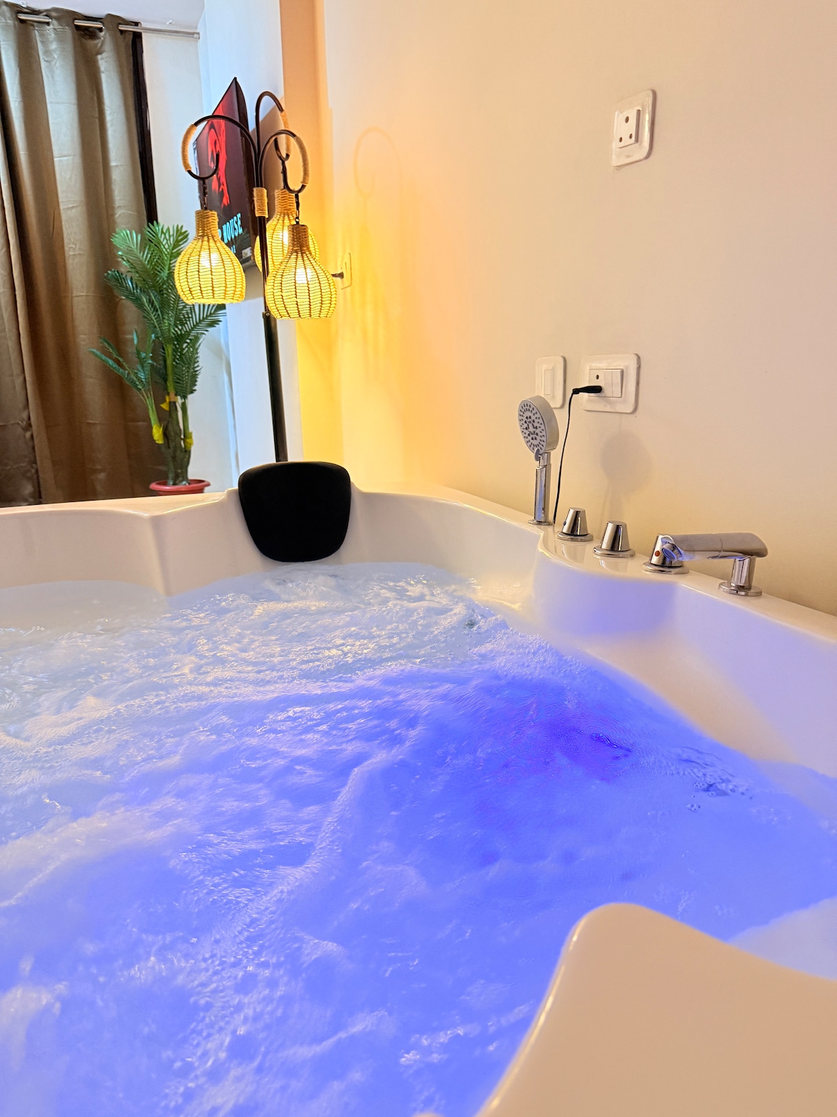 Relax, recharge, and indulge in luxury at this beautifully designed studio with PRIVATE JACUZZI, located just walking distance from Jaipur Main Railway Station. This fully equipped studio is Perfect for couples, solo travelers, and business guests seeking comfort, privacy, and style in the heart of the city. Private Jacuzzi • Curtain Bed • Private Full Kitchen • Private Balcony