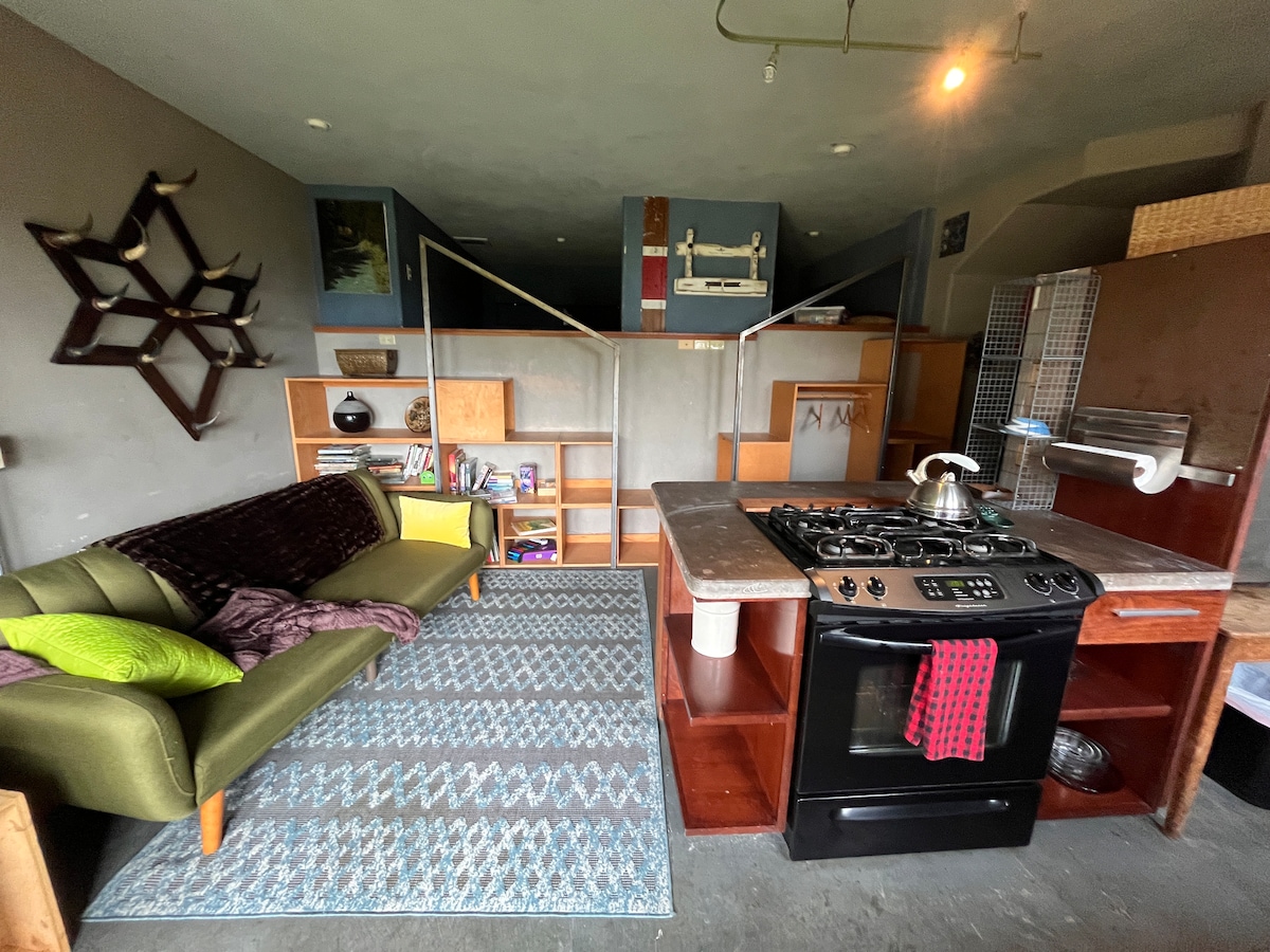 With ocean views along the coast, The Three Goat Studio is a private hideaway with its own French-door entrance and easy parking. Two cozy lofts (queen + twin), concrete floors, a spa-style shower, and warm wood built-ins create a modern coastal feel. A gas stove keeps it comfortable year-round. Three friendly goats live on the property. We live upstairs, but guests have full privacy. Our Gyppo brewery tour is available during your stay.
