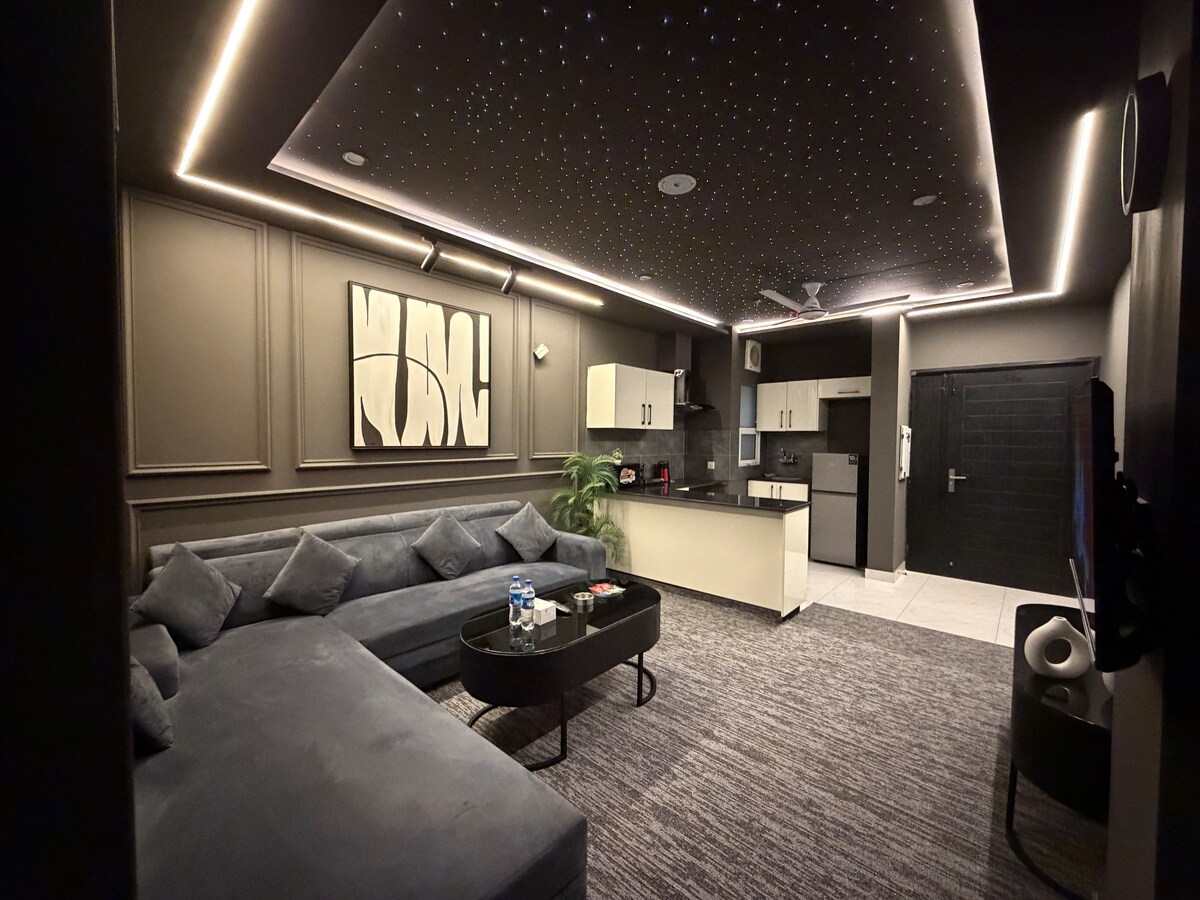 Step into a modern retreat designed for comfort and mood. The apartment features a stunning starlight ceiling that creates a calm, romantic atmosphere. Enjoy cinematic nights on a 65-inch Haier Android TV with high-speed Wi-Fi for seamless streaming. The equipped kitchen offers everyday convenience, while the soft mattress and spacious sofa ensure complete relaxation. Finished with modern interiors and artistic aesthetics, this space is perfect for cozy nights and stylish living.