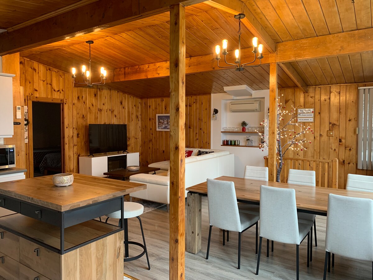 Monumental open concept, in the heart of nature. Access to trails directly behind the house. Wood stove, large modern bathroom, one bedroom + sofa bed. Another sofa bed in the living room. Ideal chalet for a couple with children or two couples. Wild birds, turkey, and deer lovers welcome! Wifi and EV charger included. Dogs Welcome! CITQ : #308038