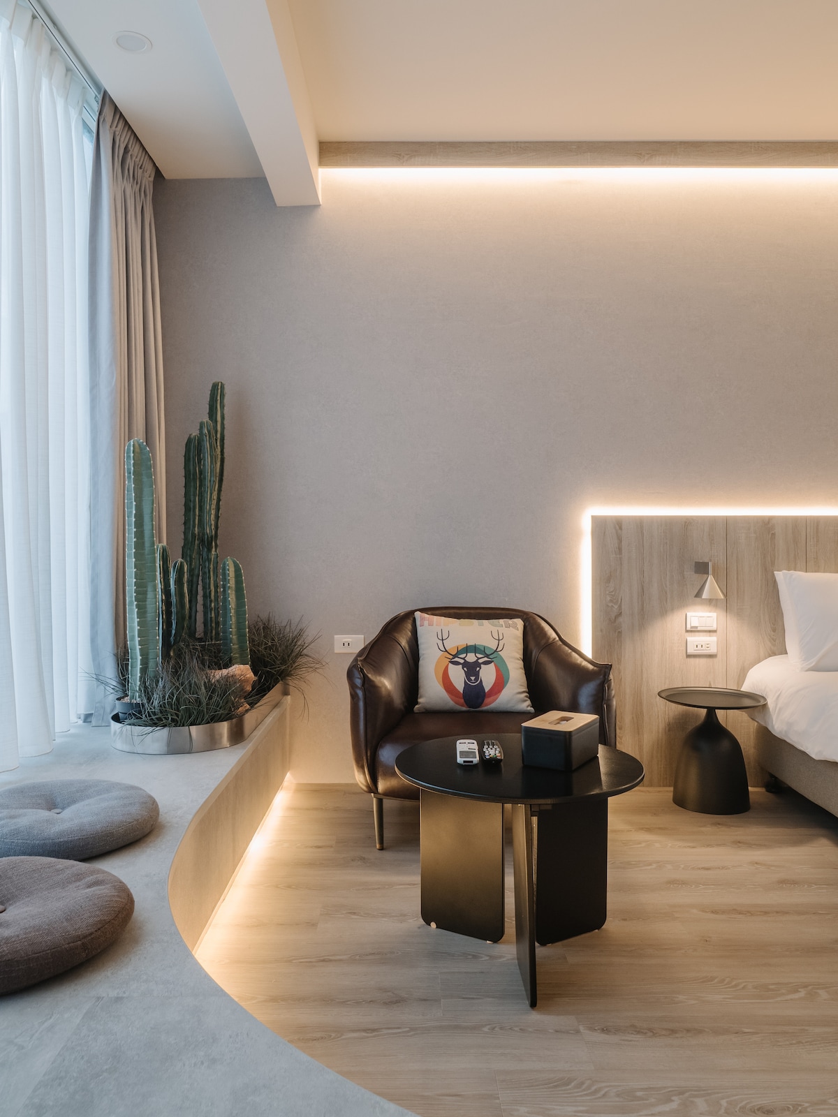 室內的灰白主色,配搭北美木紋銅色傢俱及家飾, 用心為您的居住空間提供沈靜優雅的感覺。日韓系電器的選用,不論是無線充電藍牙喇叭,大螢幕伸縮高清電視,都能滿足您對影音效果的要求。房源位於高樓內縮樓層,阻絕不必要的噪音並滿足您對景觀,安靜及隱私的要求。大樓並配有全天候警衛,住戶專屬電梯,公用大露台,以及地下收費停車場, 位處西門町核心路段,無論搭乘捷運或自駕都非常方便。Earth tone- based interior design offers warming, calm, healing and delighted atmosphere. Room facilities, including double bed, en- suite bathroom with shower enclosure, air conditioning, smart 4K TV with movies/Netflix, WIFI internet, cove lighting and music player with wireless connection & USB charger ports.