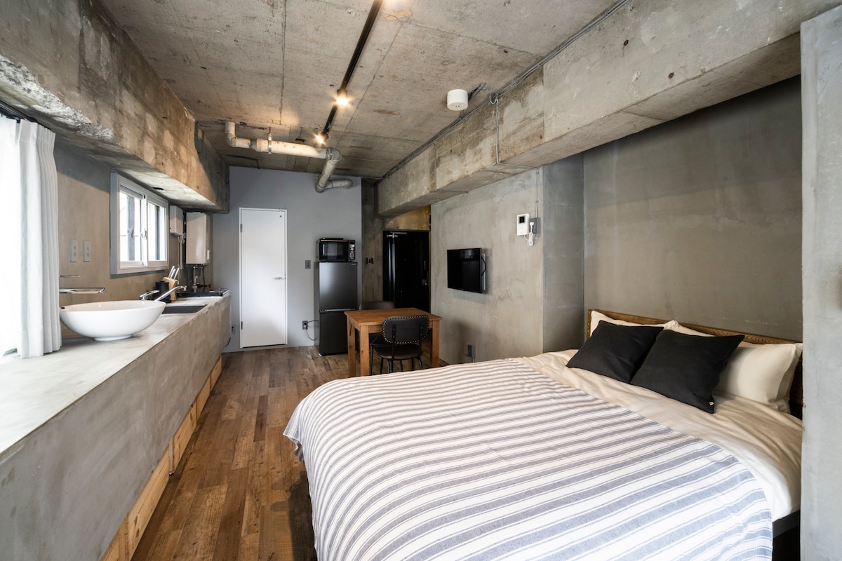 A serene, minimal loft just one stop from Shibuya and Roppongi—perfect for solo travelers or focused remote work. Featuring fast Wi-Fi, an Aeron chair, and a compact double bed (150×210cm)—ideal for one, cozy for two. The glass bathroom and sleek concrete walls give it a modern edge (note: some winter condensation—just run the bathroom fan). While there’s no closet, the space fits four large suitcases and includes a hanging bar and ten wall hooks to keep things tidy.Laundry service weekly.