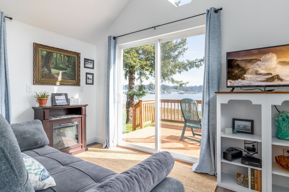 Enjoy beautiful views of the bay and wildlife including deer and a variety of birds from the large picture windows that welcome you to Bayview Cottage. Gather around the waterfront fire pit after a day of adventures to enjoy s’mores and stunning sunsets. Everything you’ll need to prepare a gourmet meal or a quick snack is provided in the fully equipped kitchen including spices, bakeware, a variety of kitchen appliances, and other cooking essentials. All three beds feature memory foam and cozy bedding to provide a wonderful night’s sleep. The house is fully stocked with Smart televisions including cable, high speed wifi, a washer and dryer, toiletries, and plenty of books, puzzles, toys and games. Bayview Cottage is an ideal home for families or a group of friends enjoying the beautiful Southern Oregon Coast! Bayview Cottage may also be rented in conjunction with Bayview House, a larger home that sleeps 4 guests and is located right next door. Consider renting both homes together for larger parties or a gathering where families may want their own space. Together both homes can accommodate parties of 8 and each home has a full kitchen and a washer/dryer! This waterfront property is great for cozy evenings around the firepit. During low tide clam from the property or take a nature hike around the bay. Large picture windows provide views of the incredible sunsets while staying warm and cozy indoors. Along with the cottage, enjoy the deck with lawn chairs as well as the waterfront fire pit in the private backyard. I am available by phone, text or email at anytime during your stay. I live nearby if you need anything while you are at the cottage. The cottage is located just a few blocks from Downtown North Bend, a small coastal town with shops, restaurants, antique stores and pubs. Located at the end of a quiet road next to a nature park providing ample opportunity to observe wildlife including deer and many birds. A short drive to several beaches and sand dunes for a day full of outdoor adventures. Plenty of parking for your toys including boats and trailers is available. World famous Bandon Dunes Golf Course is less than a 30 minute drive away! Conveniently located just a few blocks off of the Scenic Coastal Highway and a quick 5 minute drive to the North Bend airport.