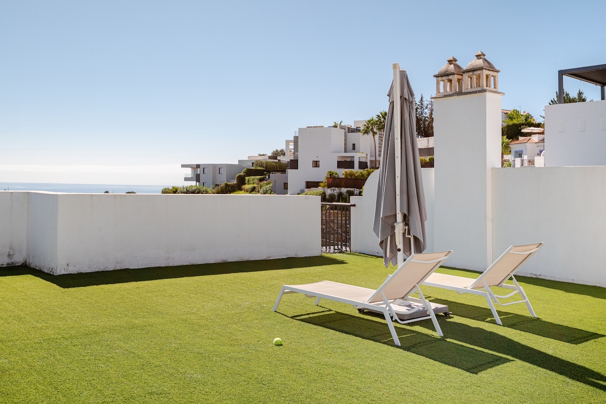 High-end condo with private garden in a privileged position. This spacious 3 bed / 3 bath all en-suite garden apartment has panoramic views over the sea to Gibraltar and the African coast. Located in an exclusive complex with 24 hours security, 2 outdoor pools, 1 heated indoor pool, gym, saunas and rooftop jacuzzi. Highlights include a biofuel fireplace and fibre internet. Please note that for stays of 28 days or more you are responsible for your electricity bill.