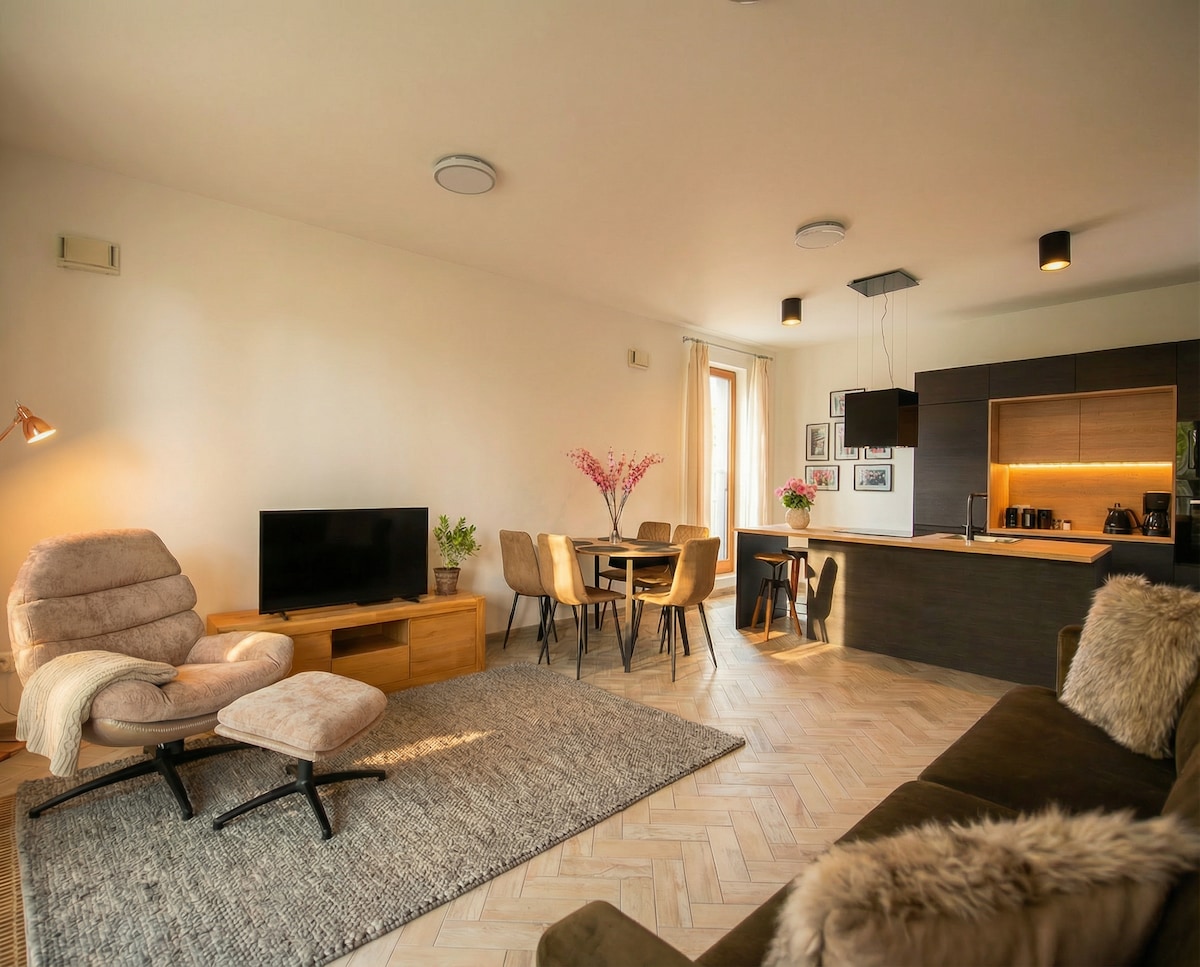 This modern attic apartment blends traditional craftsmanship with a contemporary touch, creating a warm and comfy spot to relax and enjoy vibrant Krakow. You’ll be in the heart of it all — just a 5-minute walk from the train station, the Barbican, St. Florian’s Gate, the Main Market Square, and the city’s largest outdoor food market. The Kazimierz district, full of cafes, bars, and street life, is just a few tram stops away.