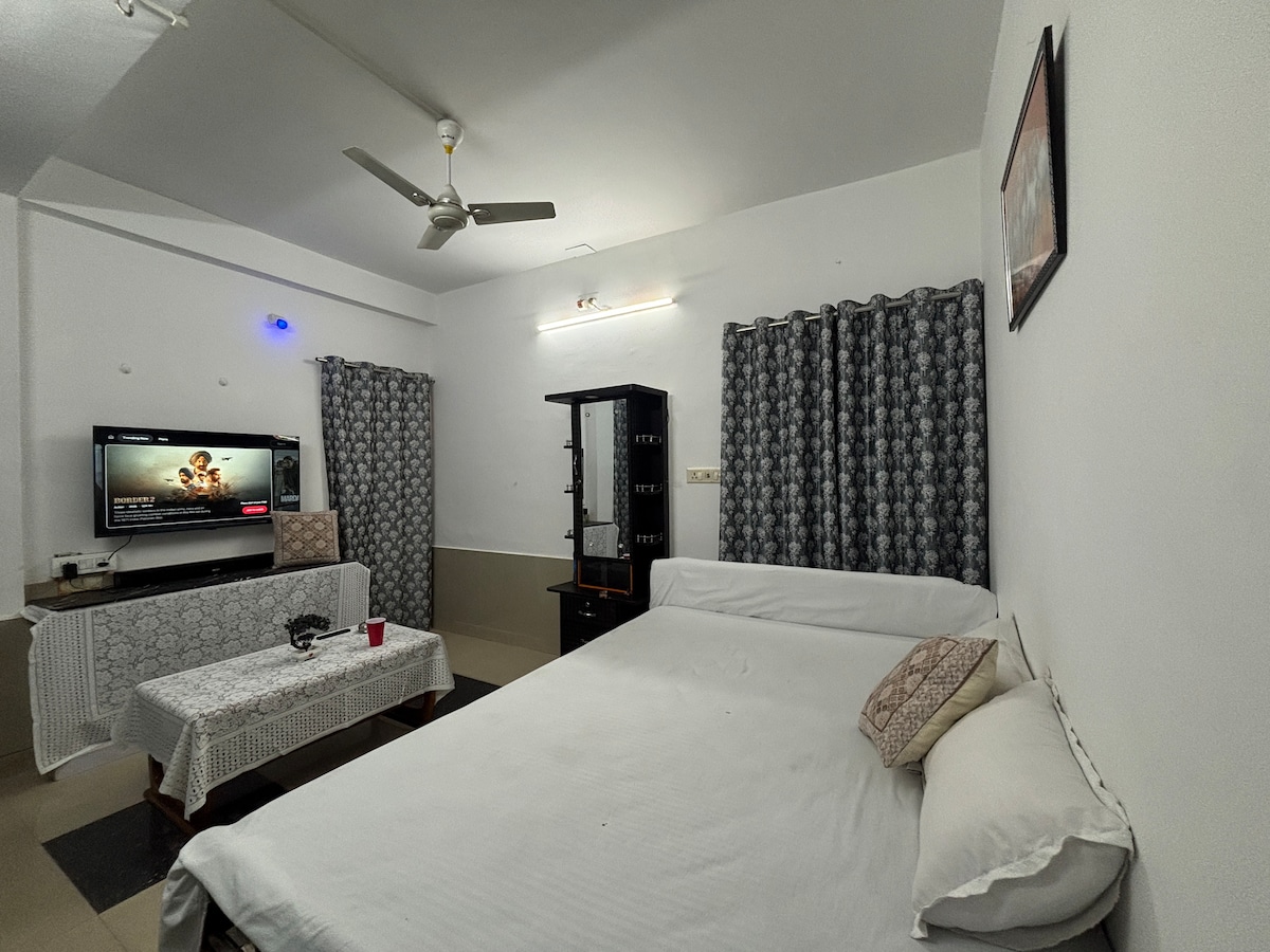 Welcome to a brand-new 2BHK apartment, designed for guests who value comfort, peace, and a homely atmosphere. Located in a prime yet peaceful neighborhood, ideal for families, friends and all. •Spacious 2BHK modern interiors( AC in 1 room) • Third-floor apartment offering privacy, better light, and ventilation •Well-equipped kitchen for home-style cooking •Balcony & open spaces with plenty of natural light and fresh air • Safe & hygienic environment • Parking for your convenience