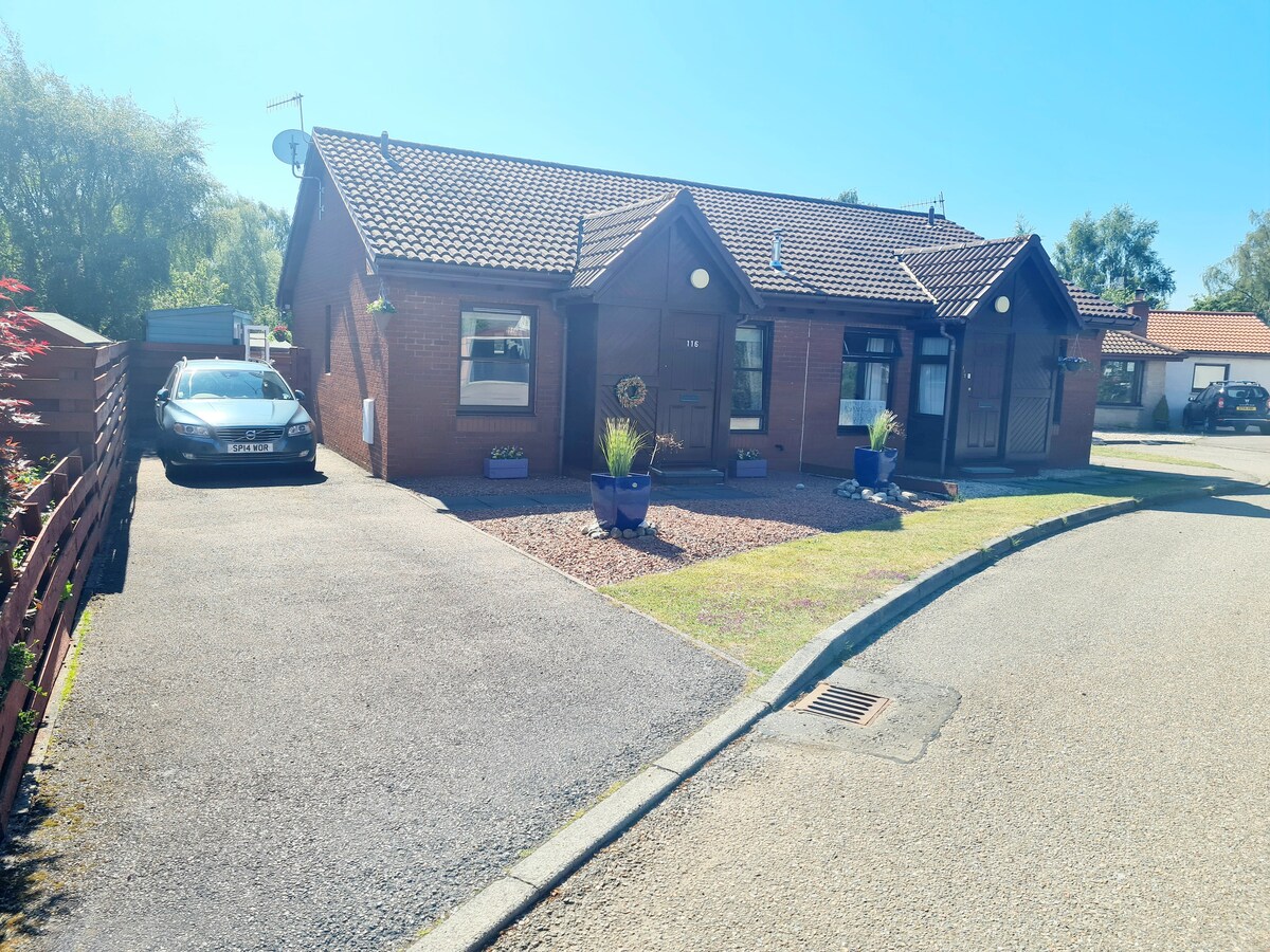 Warm 2 bed bungalow (sleeps 4-5) awaits you for a home from home stay in the picturesque town of Aviemore, located within the spectacular Cairngorms National Park. Complete with it's own private back garden and driveway for 2 cars. A few minutes walk to Dalfaber Country Club and the centre of Aviemore is a short 8 minute stroll along a lovely path into town. Double bedroom with shower room. Twin Bedroom Small Sofa Bed in Livingroom (occasional use)