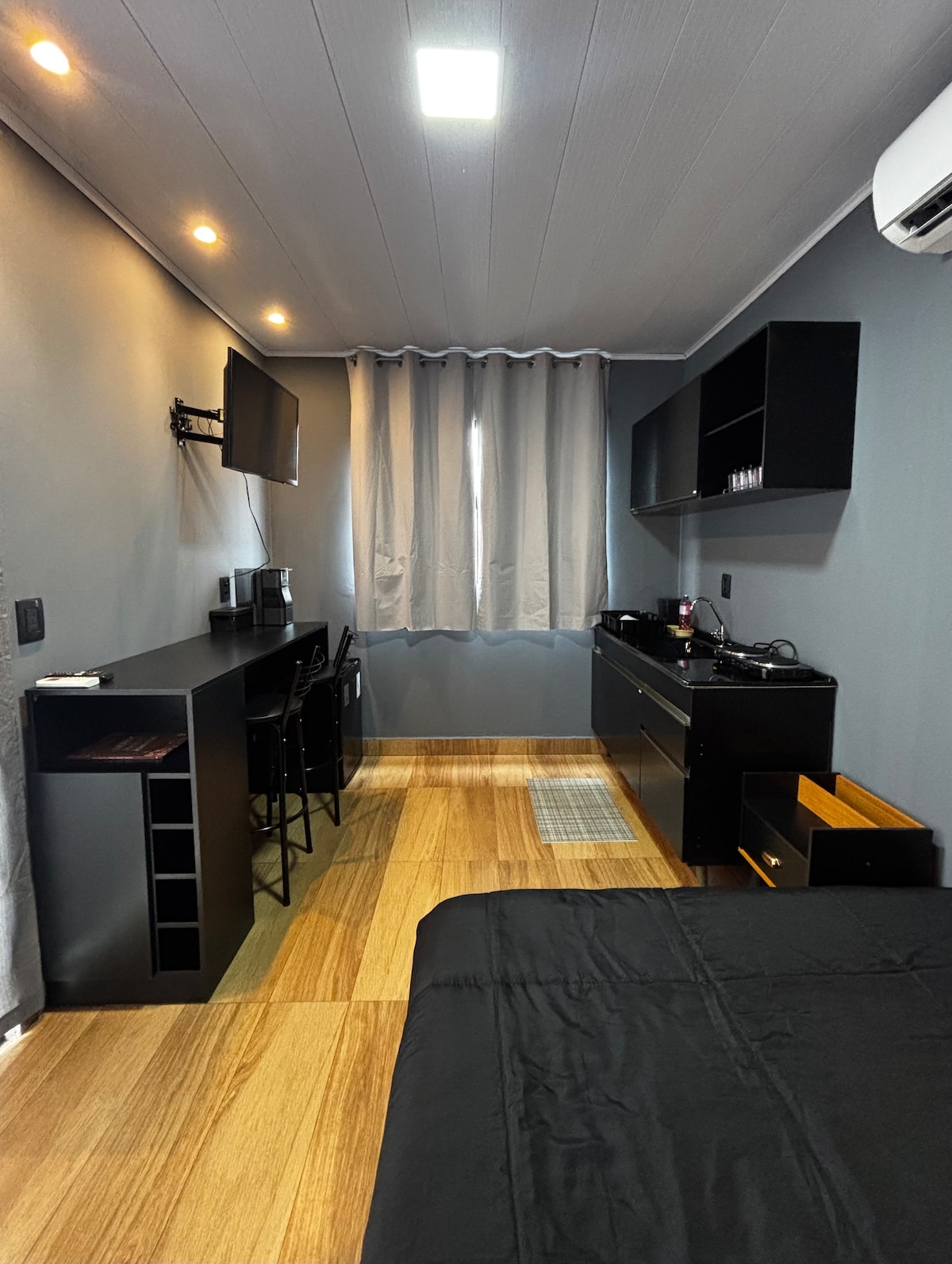 Conheça nosso estúdio container compacto e completo, a poucos minutos do centro! Com uma cozinha funcional e área de estar acolhedora, este espaço é perfeito para sua estadia. Aproveite o quintal privativo para relaxar e a garagem exclusiva para maior comodidade. Uma opção ideal para quem busca conforto e praticidade em um só lugar!