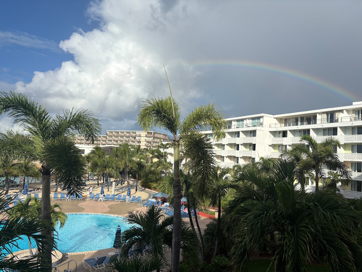 oceanfront condo overlooks Dawn Beach and the Atlantic Ocean. 3 bedroom, 2 bath approximately 1700 sq. ft. sleeps 8. infinity pool swim up bar BBQ grilling area Fitness center Balcony flat screen TVs Complimentary Wi-Fi Washer & dryer full kitchen with cookware, coffee machine, fridge, oven, cooktop, microwave, toaster, iron & ironing board. 3 bedrooms with king beds and a pull-out couch.