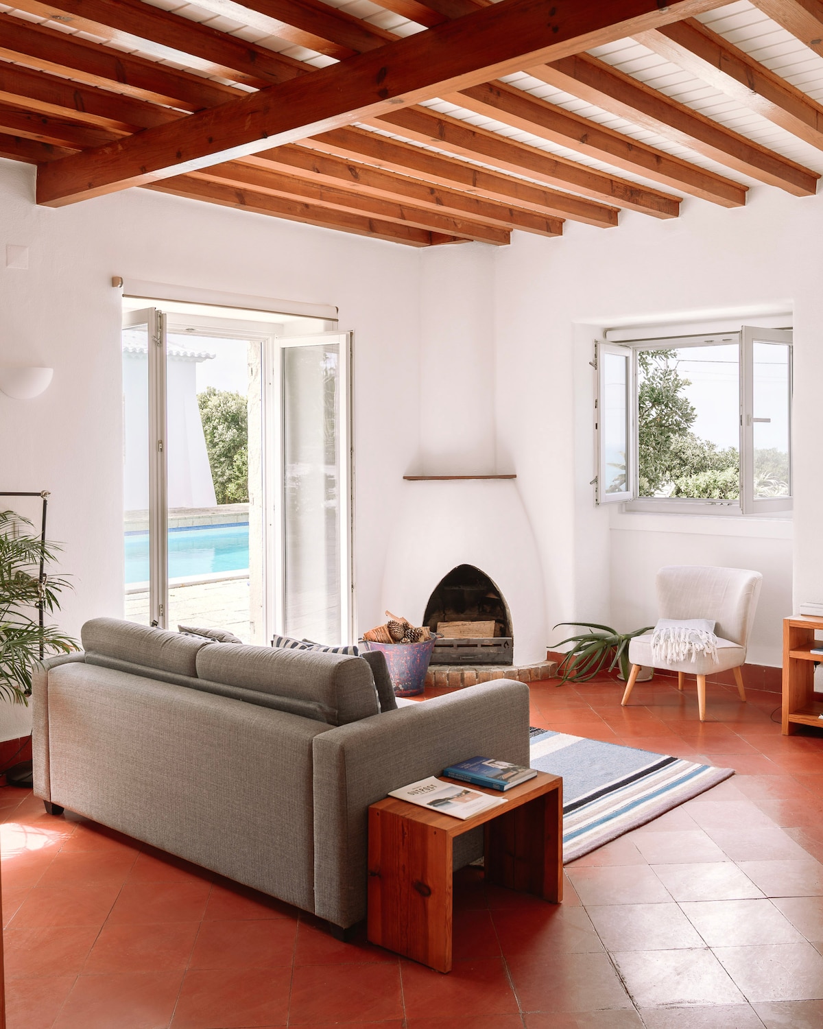 The South Wing is an apartment for up to 4 guests at OUTPOST - Casa das Arribas, set on the cliffs just outside Azenhas do Mar, with direct access to the pool and unobstructed views over the Atlantic. Original terracotta floors, wooden ceilings and a corner fireplace give the space a warm, understated character, combined with a clean, minimal interior. A calm, design-led space that blends original charm with a contemporary coastal feel.