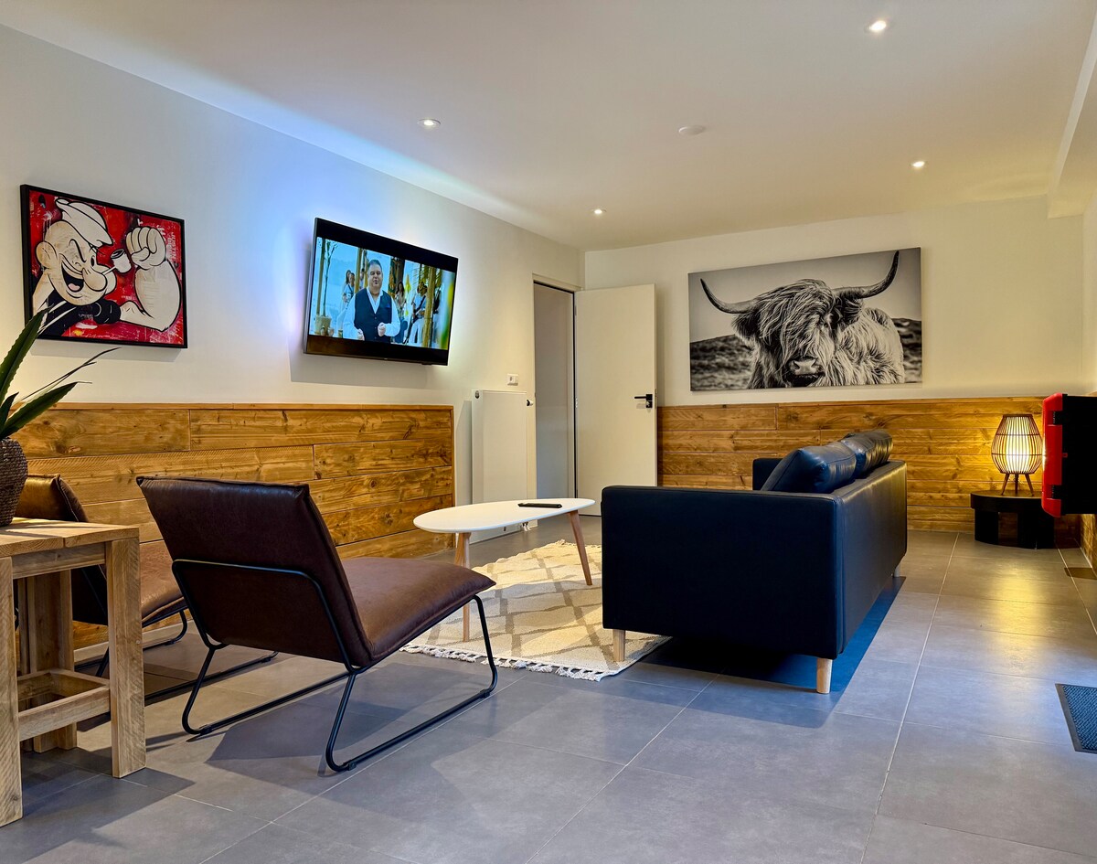 Nearby historic centre of Sittard. (walking area) 1st Floor: bedroom 1 , 2x 1personbed with access to cosy outdoor terrace with garden furniture; Spacious and modern kitchen, spacious living room with dining area, 2 lounge sofas, HD TV and fun Tower corner. 2nd Floor: bedroom with Queensbed and 2 x onepersonbed; bathroom with toilet and walk-in shower;Separate ironing/dry/laundry room.Washingmachine and dryer