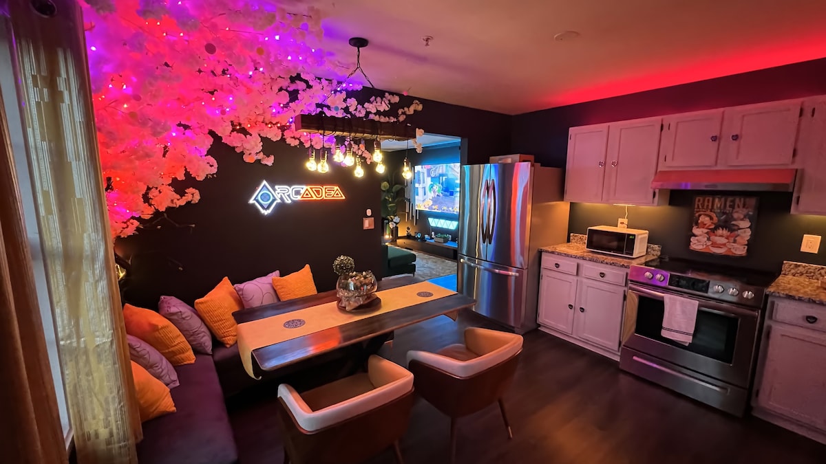 Hello, and thank you for your interest in Arcadea, an Idyllic gaming and anime smart home like you have never seen before. Each room is a unique zen masterpiece personally decorated with smaller custom-made pieces showcasing some of your favorite Japanese video games and anime. We wanted to make this place a paradise for the gamer/otaku in you and those who might not know much about either subject. Located an 18 minute walk from historical Marietta square, full of shops and restaurants